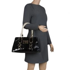 Versace Black Signature Nylon And Croc Embossed Patent Leather Flap Compact Wallet For Women