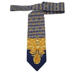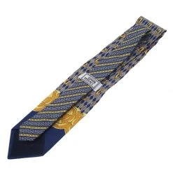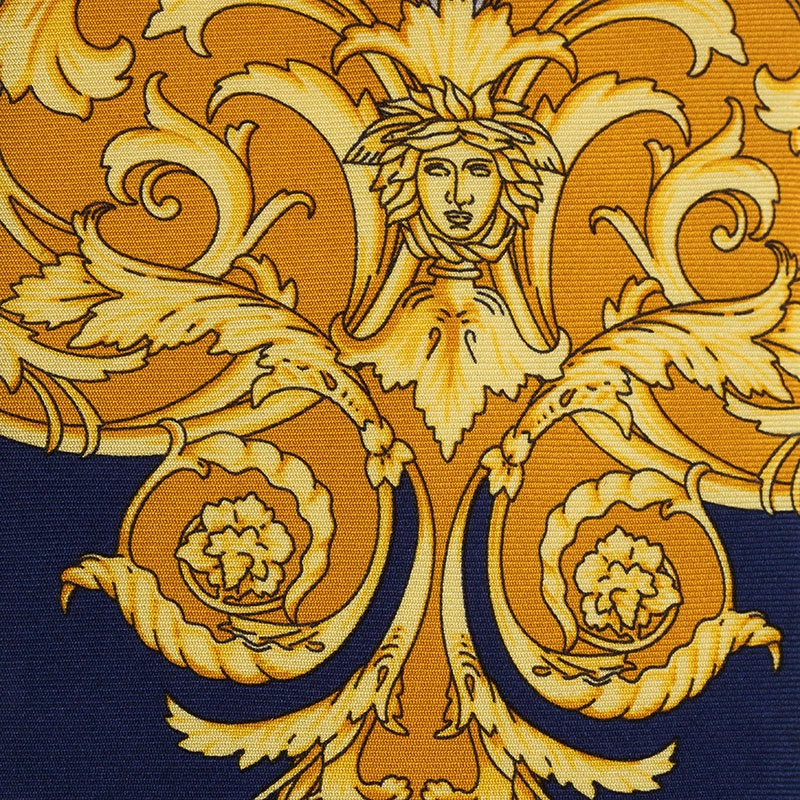 Cut is silk, this tie from Versace, features the signature Medusa face along with flora fauna in tonal yellow and blue tones.