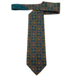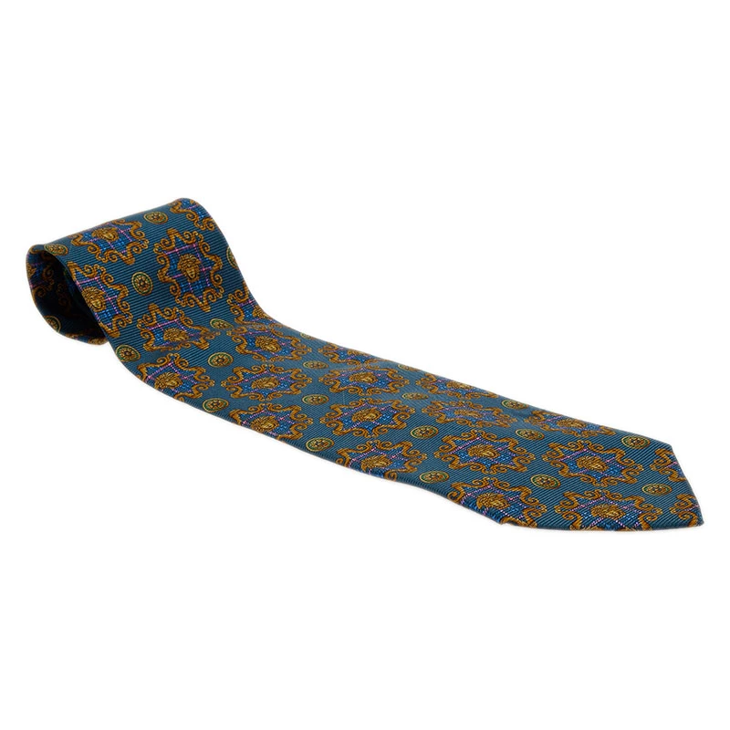 Cut in silk, this tie from Gianni Versace, features the signature Medusa face along with design elements in yellow and blue tones.