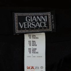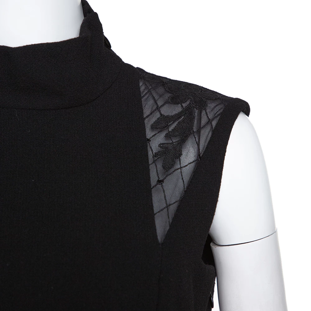 This stylish Gianni Versace Couture dress is great for formal occasions and will make sure compliments keep coming your way. Crafted from wool, silk and rayon, this black ensemble has a sleeveless silhouette. It is styled with panels and intricate lace trims that add interest. It has a high neck, zip closure and a good fit. Pair with high heels.