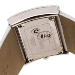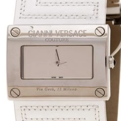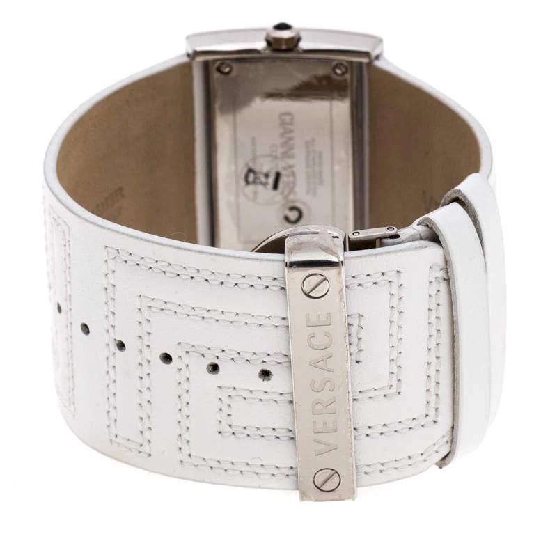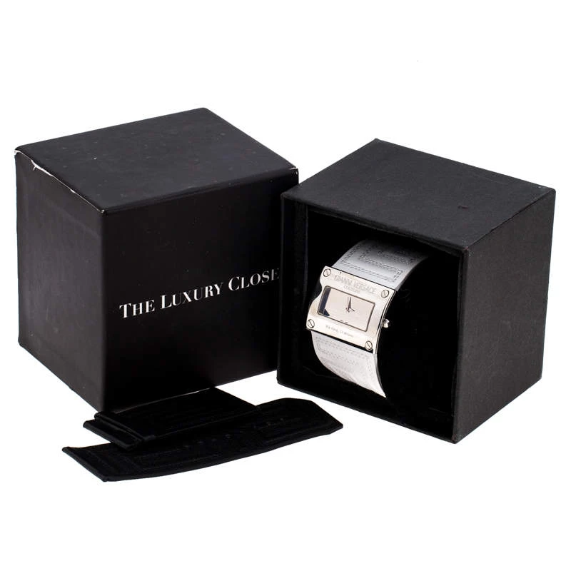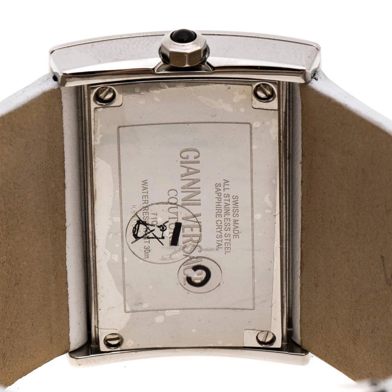 Stand out with this Versace wristwatch. Made from stainless steel, the rectangular case holds a punctuated bezel with screws and the brand label engravings. Its silver dial is complemented with two petite hands. Featuring a 30m water resistance level, this quartz watch has wide, stitched leather straps with engraved clasp closure.