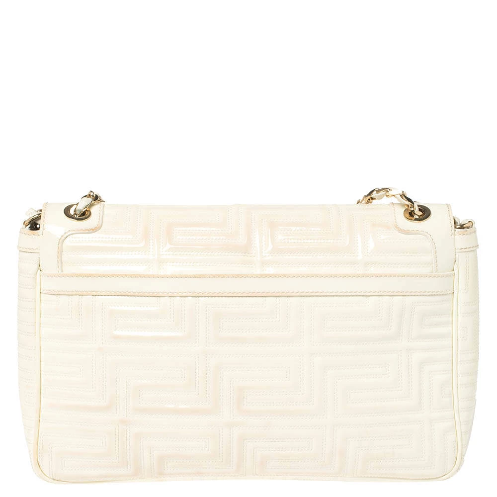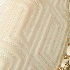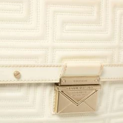 This dainty bag from Gianni Versace is designed to complement your elegant appeal and exudes a classy aura. Skillfully crafted from patent leather in a logo-quilted design, it features a splendid white hue. The bag suspends from a leather woven chain strap, and the front flap is adorned with a gold-tone lock. The accurately spaced fabric interior ensures there’s ample room for your necessities.