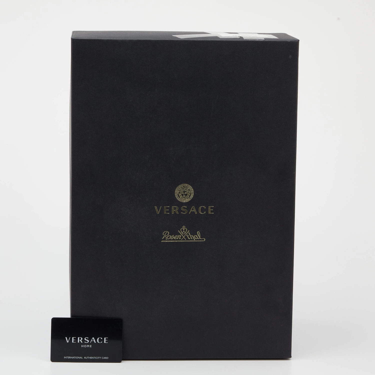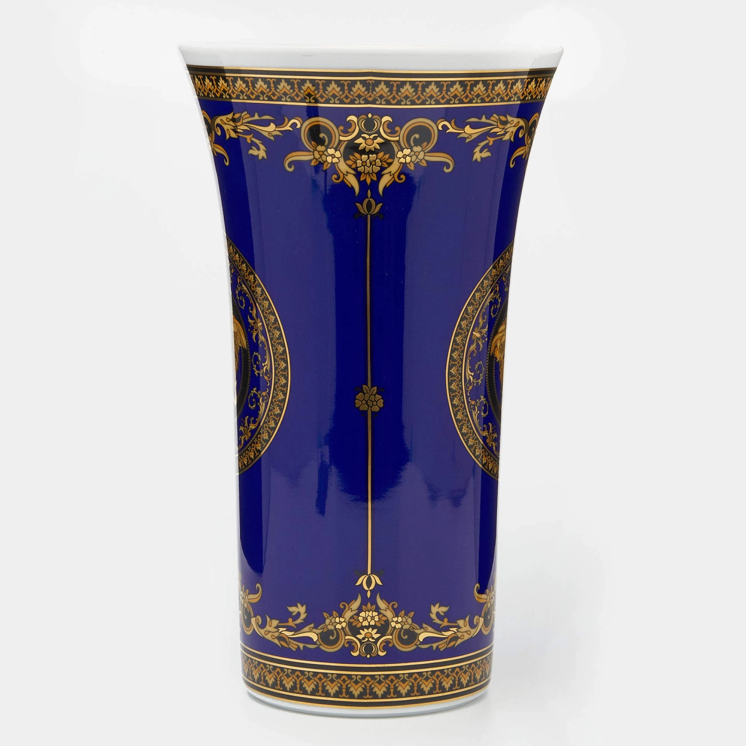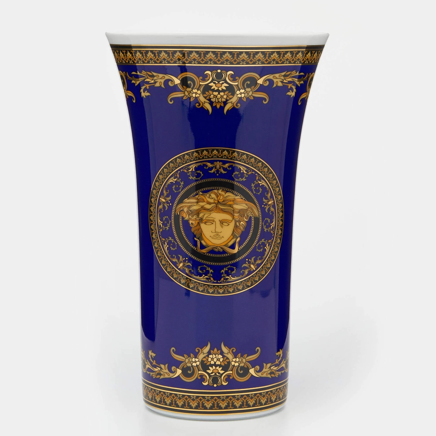 Exuding opulence, this ornate Medusa vase is a result of the glorious collaboration between Versace and Rosenthal. True to their brand aesthetics, both have brought glamour, sophistication, and most of all awe-inspiring detail to this porcelain piece. With a sturdy bottom and a rounded body, this vase is delicately adorned with the signature Medusa logo in the center and vintage designs on the neck, center, and bottom. It is a creation that will sit gracefully on any table and become an heirloom that is cherished for a long time to come.