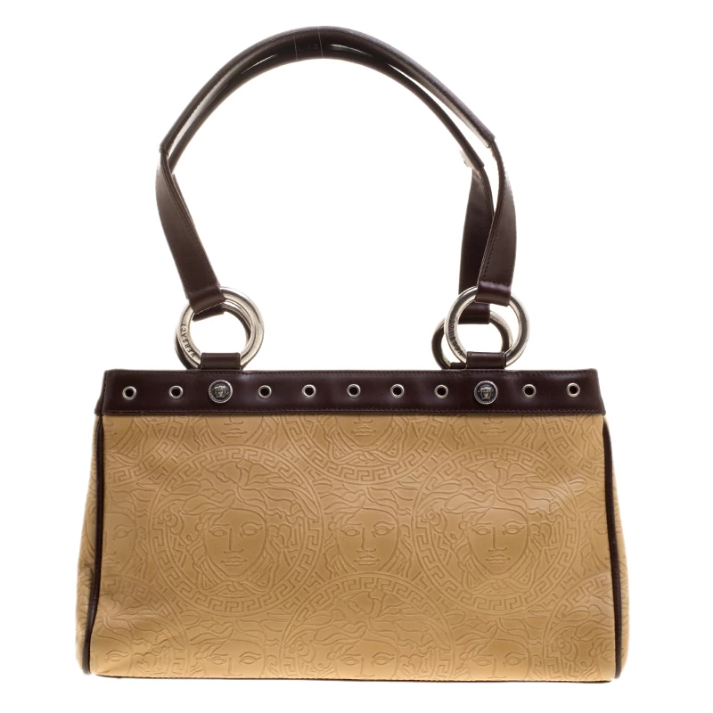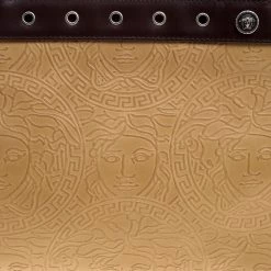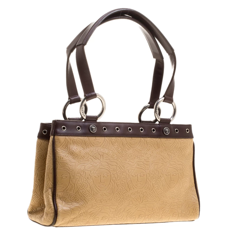 This tote by Versace is a piece all fashionistas must look out for! Meticulously crafted from Medusa-embossed leather, it features a beige shade with two brown handles and a spacious satin-lined interior. It is complete with eyelets and their logos.