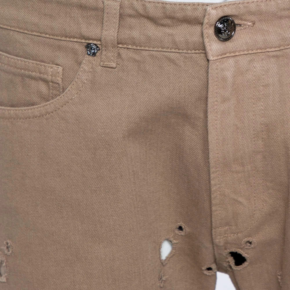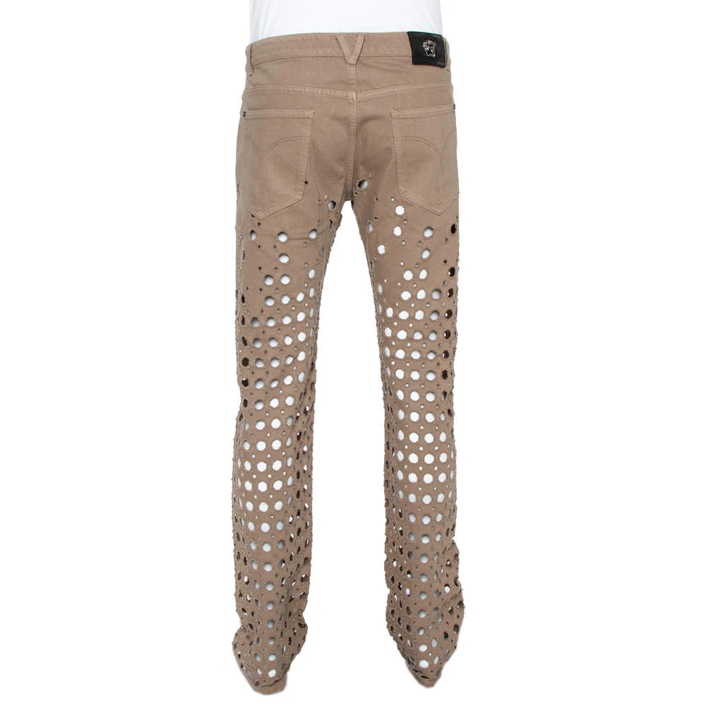 These beige jeans from Versace are anything but ordinary and will prove to be an amazing buy! They are made of denim fabric in a straight-leg silhouette and styled with perforated details, belt loops, a front button and zip fastening, and five pockets. They’ll look great with your casual T-shirts and loafers.
