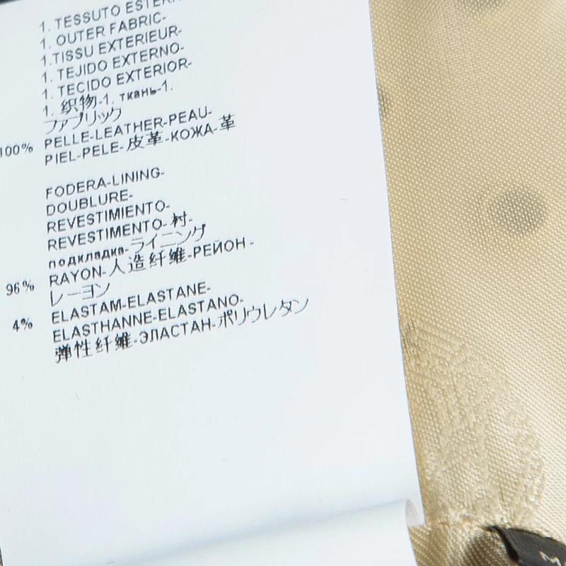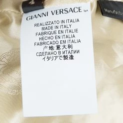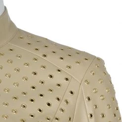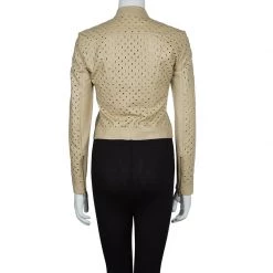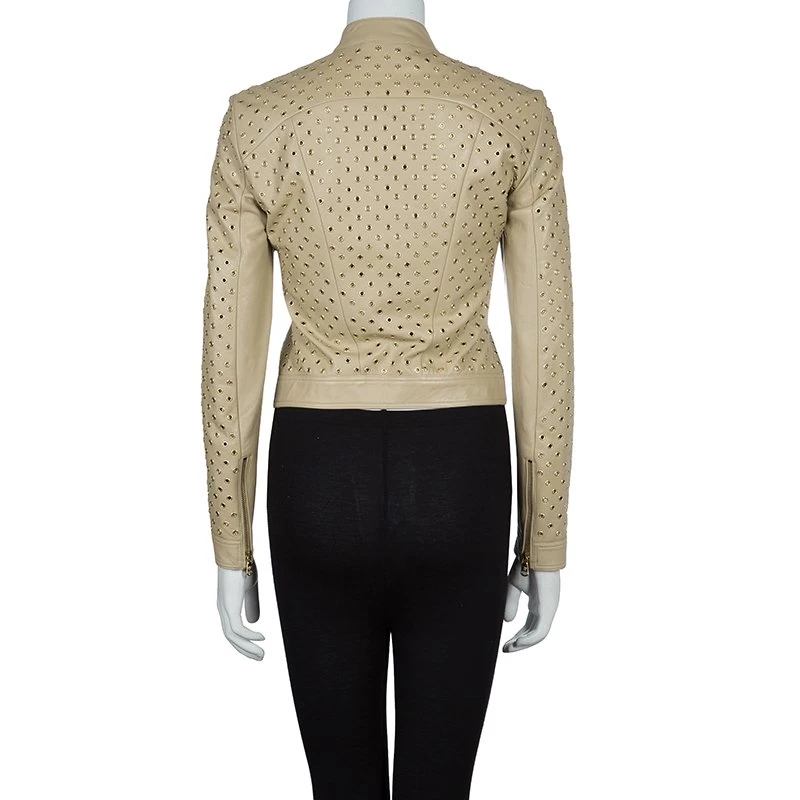 This stunning Italian-made jacket from Versace has an exquisite appeal of a bold yet feminine style statement. Crafted in supple beige leather, the jacket features gold-tone eyelets, zips on the front and the cuffs, and buttons on the banded collar. Tailored with two front and two back dart panels, the collar, cuffs, half arm lengths and round bottom hem is designed in plain leather for highlighting the eyelets. The lining is a blend of rayon with a hint of elastane.