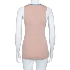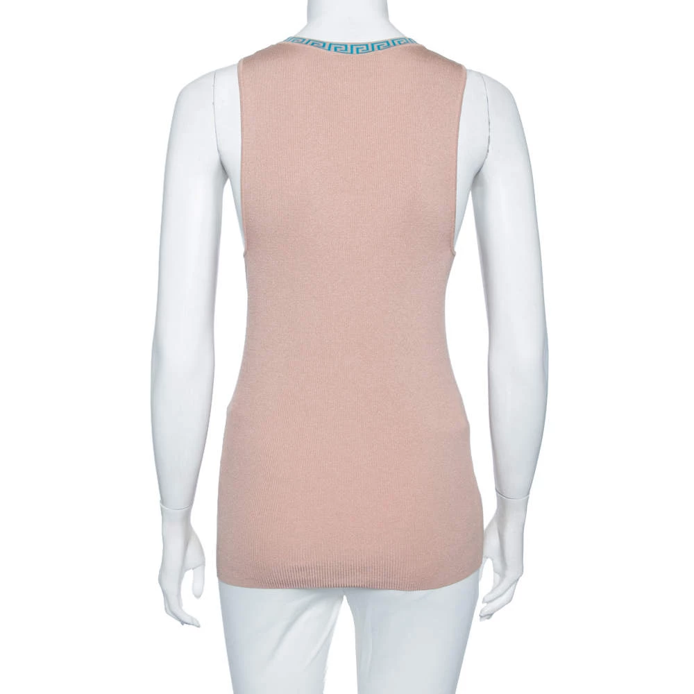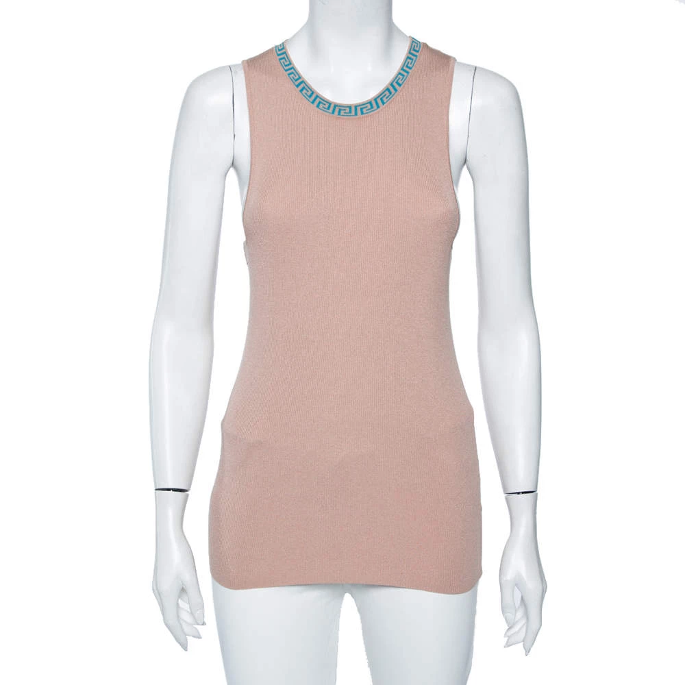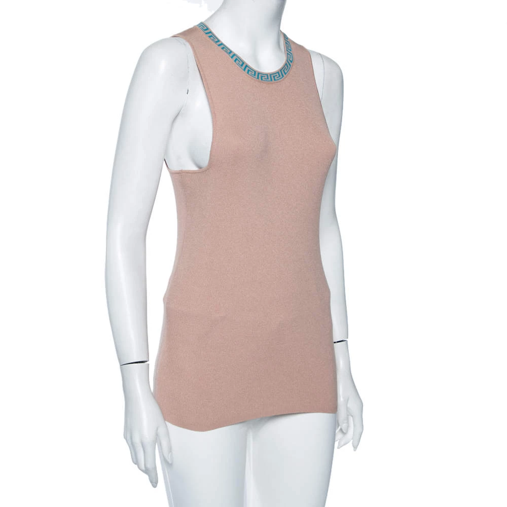 This Versace tank top is such a chic creation! The logo detail on the neckline adds an opulent touch to the top. It will look stylish when tucked inside paper bag jeans and finished off with matching chunky sneakers.