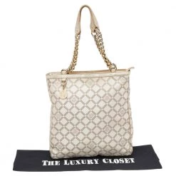 Attain a chic look when you carry this Versace bag in style. Crafted from signature canvas & leather in a beige hue, the bag is held by dual handles and is equipped with a spacious satin-lined interior. The creation features a gold-tone logo charm.