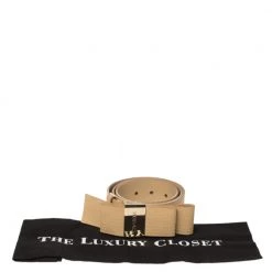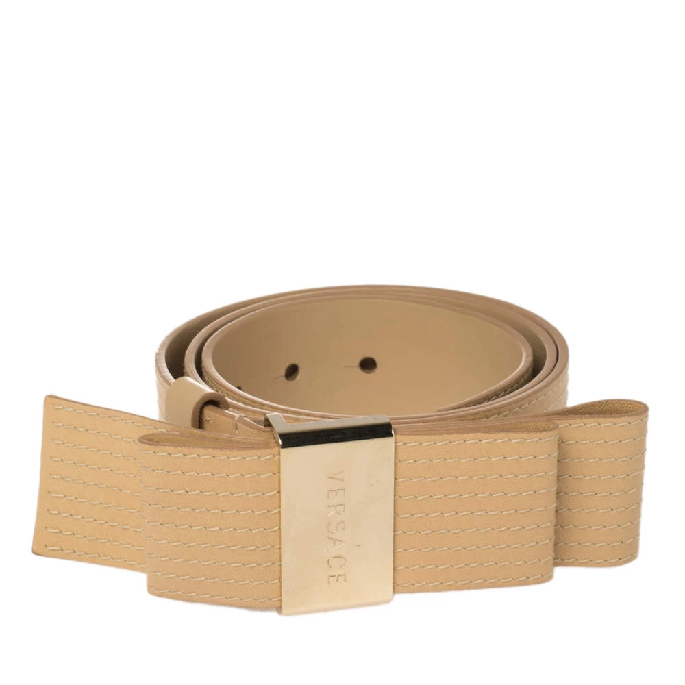 Versace’s beige leather belt for women is designed to be durable. The surface is detailed with tonal stitches and the front is adorned with a bow for an elegant look. Style this belt over your dresses, pants, and skirts for a stylish update.