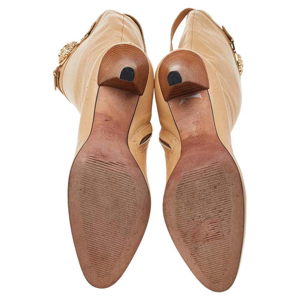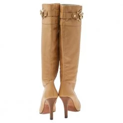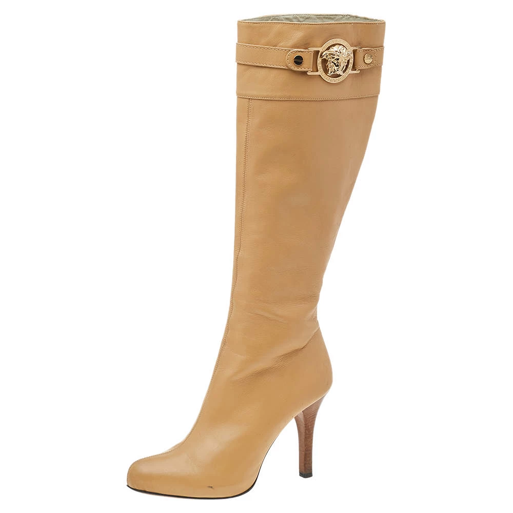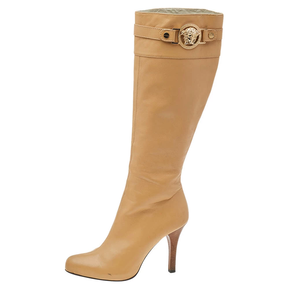 Chic boots are closet staples for any woman and what better than one from the house of Versace? Crafted from beige leather in a knee-length silhouette, they are designed in an almond-toe silhouette, Medusa motifs, and are raised on sturdy heels.