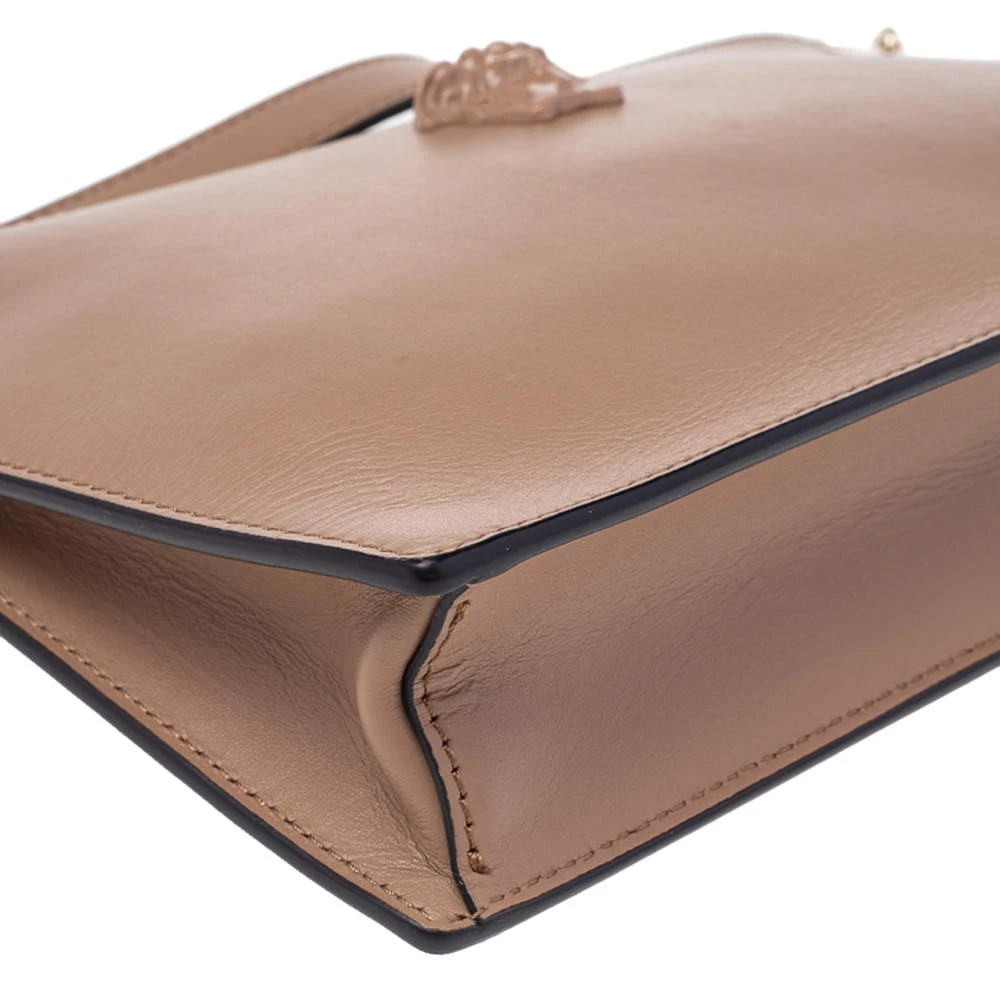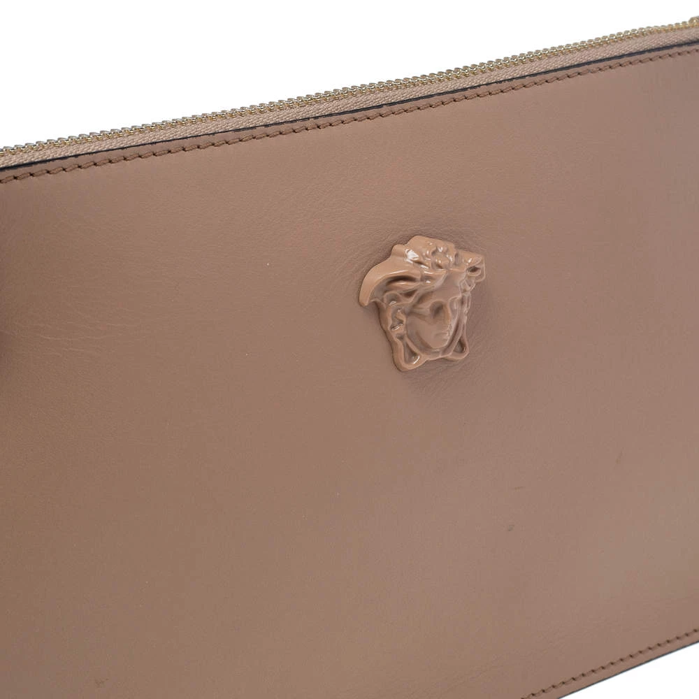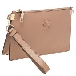 This Versace clutch is great for special occasions and will make sure you stand out from the crowds. Crafted in Italy, it is made from quality leather and comes in a lovely shade of beige. It is styled with the iconic Medusa motif on the front that adds interest, gold-tone hardware, and a zip closure that leads to a fabric interior. It is finished with a wristlet strap.