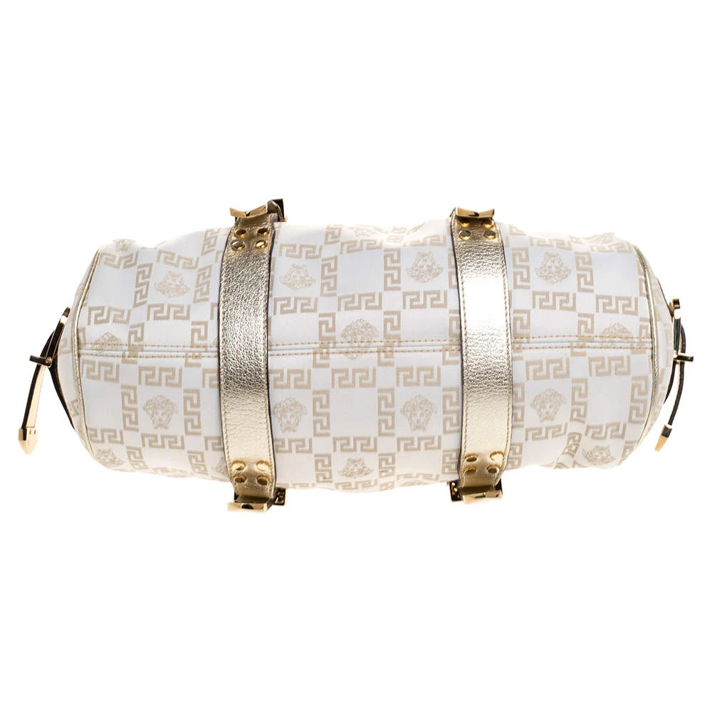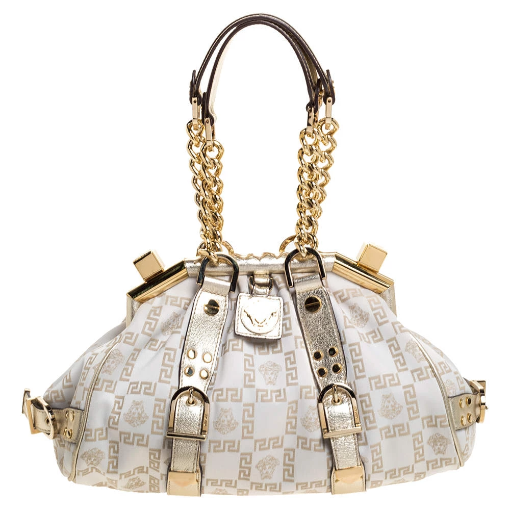The Madonna bag from Versace is made from canvas and metallic leather. It comes with two chain handles with leather rest, gold-tone hardware and a logo charm on the front. It is lined with fabric on the inside and will easily hold your necessities.