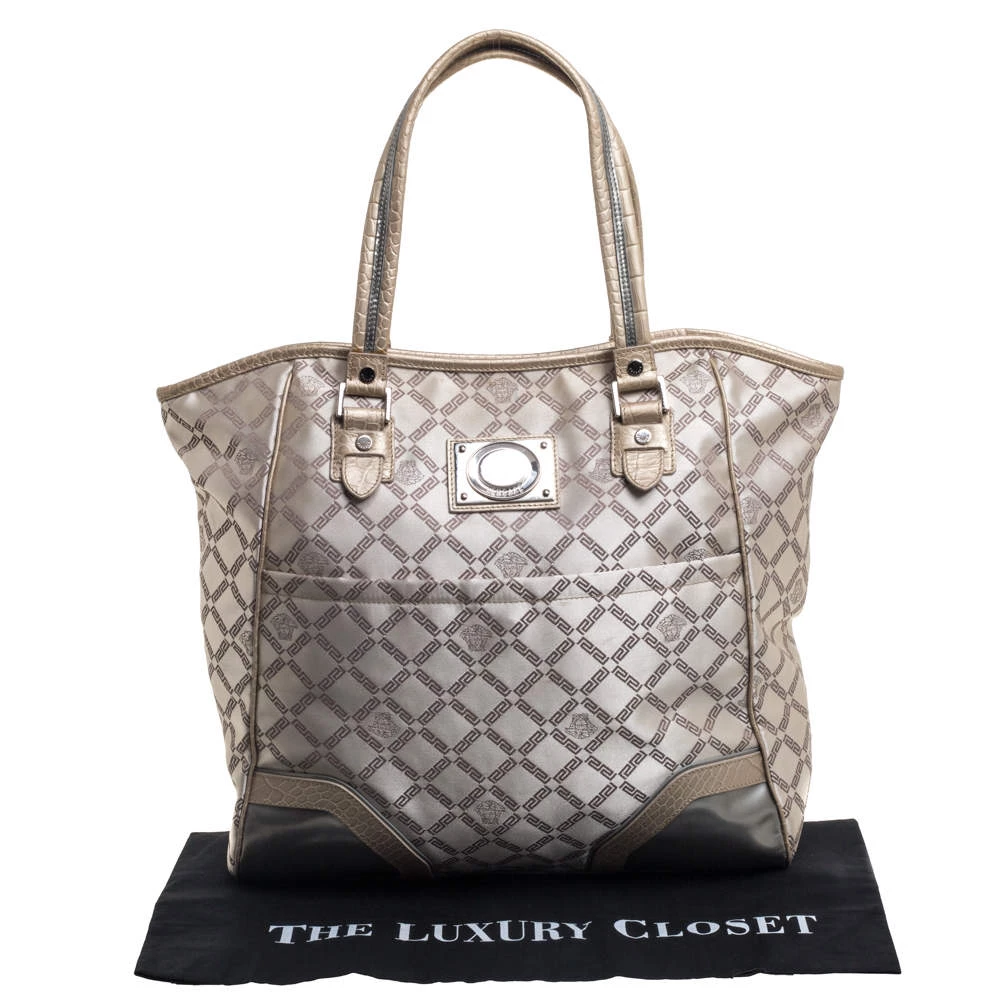 This fabulous tote by Versace is a bag ready to blend in with the busy lifestyle of the women of today. Meticulously crafted from monogram fabric and croc-embossed leather, it features a classy beige hue and dual top handles for you to parade it. The bag flaunts the iconic Medusa logo detailing on the front and comes equipped with a spacious satin-lined interior that has a zip pocket. Complete with silver-tone hardware, this tote will make an ideal buy!
