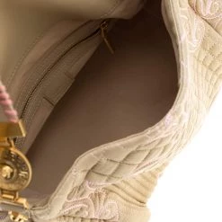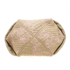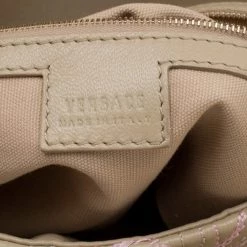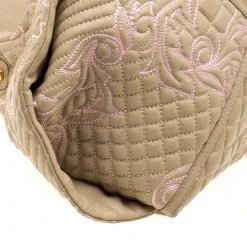This Versace handbag is meticulously crafted from quilted leather. The Barocco bag delights not only with its appeal but structure as well. It is held by a single handle, adorned with a lovely embroidery all over and equipped with a spacious canvas interior. The unique shape, the notable Medusa logo at front in gold-tone, and the impeccable style effortlessly add to the marvel of this coveted piece.