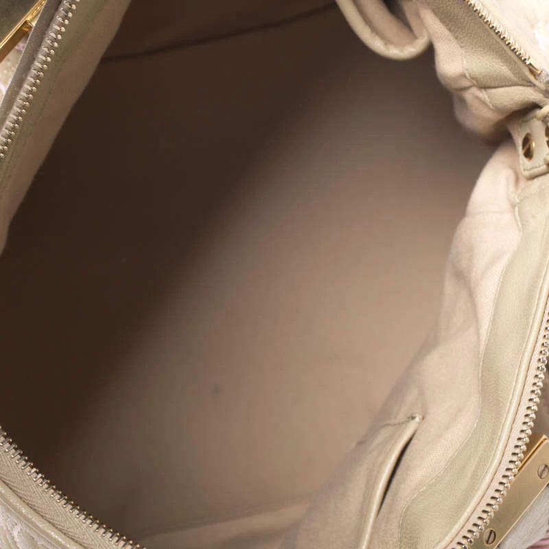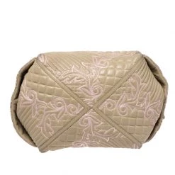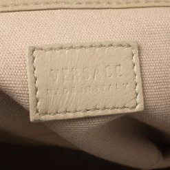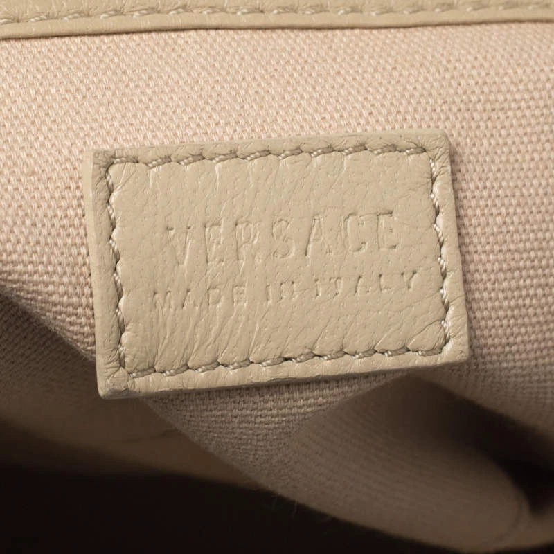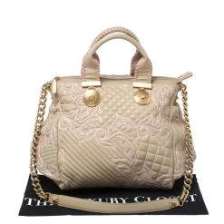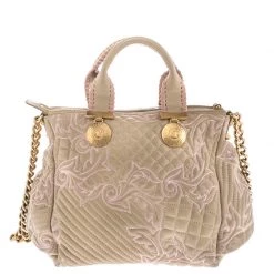 How gorgeous is this satchel from Versace! Crafted from beige-pink leather and gold-tone hardware, it carries an outstanding quilted design all over the exterior. It has a canvas interior secured by zippers and it is held by two handles. The Medusa motifs uplift its beauty and make it a buy you will not regret.