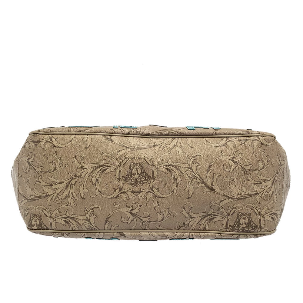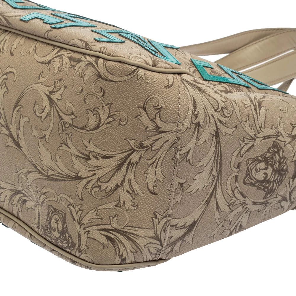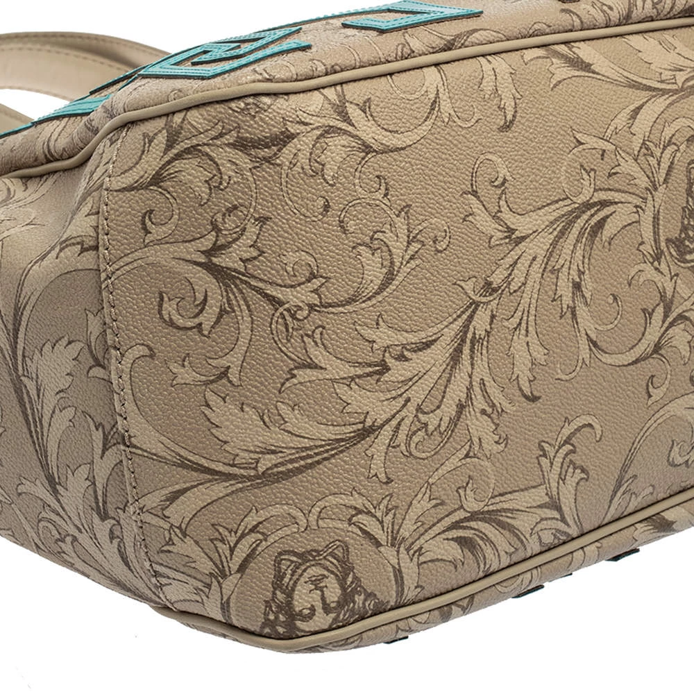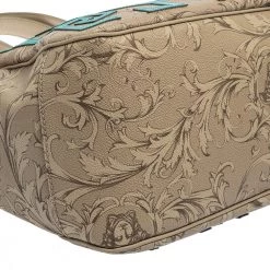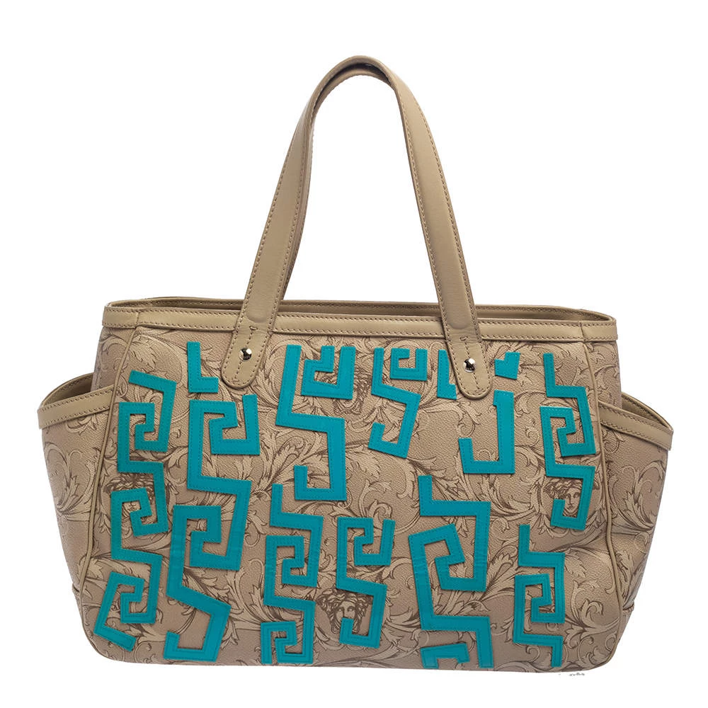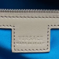 This Versace Diaper bag is made from beige printed canvas with blue signature motifs. It boasts of an ultra-spacious satin-lined interior that houses one zipped and a slip pocket. It is equipped with double leather handles for easy carrying experience and exterior slip pockets on both sides.