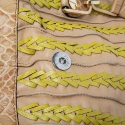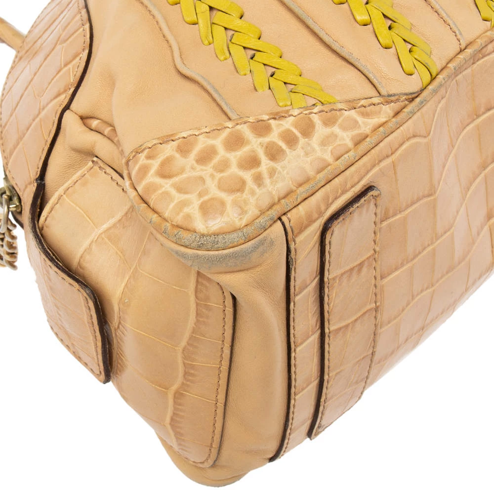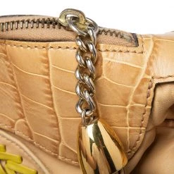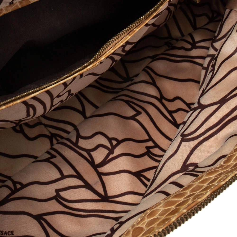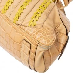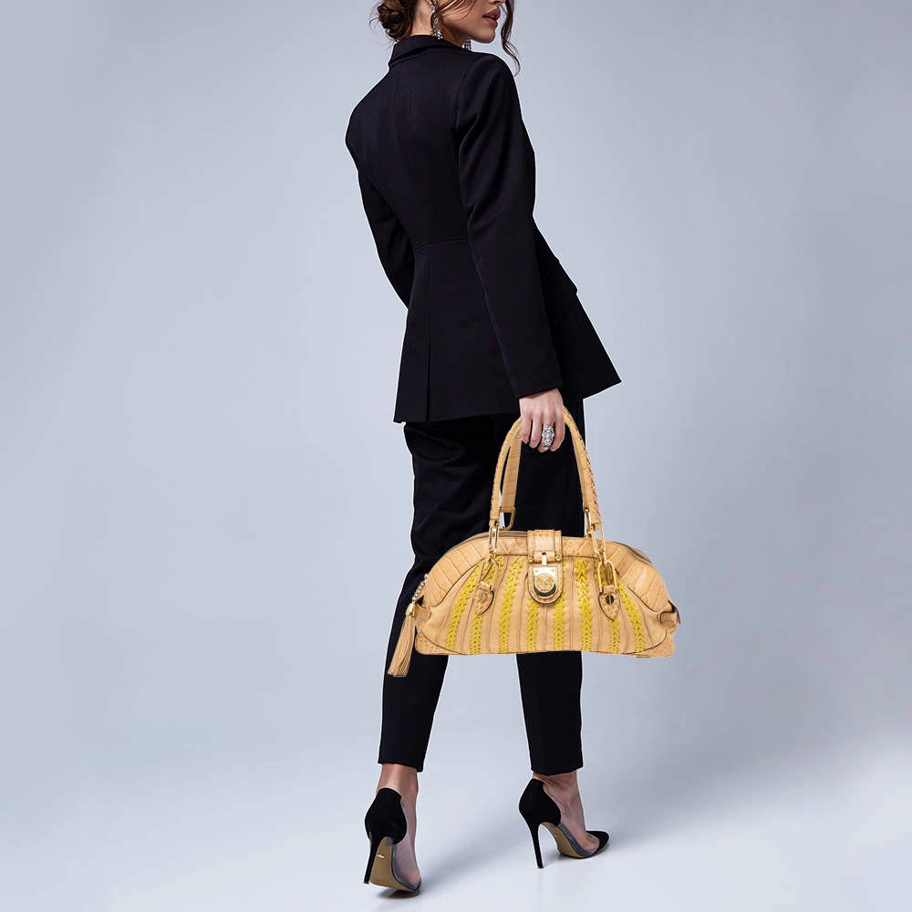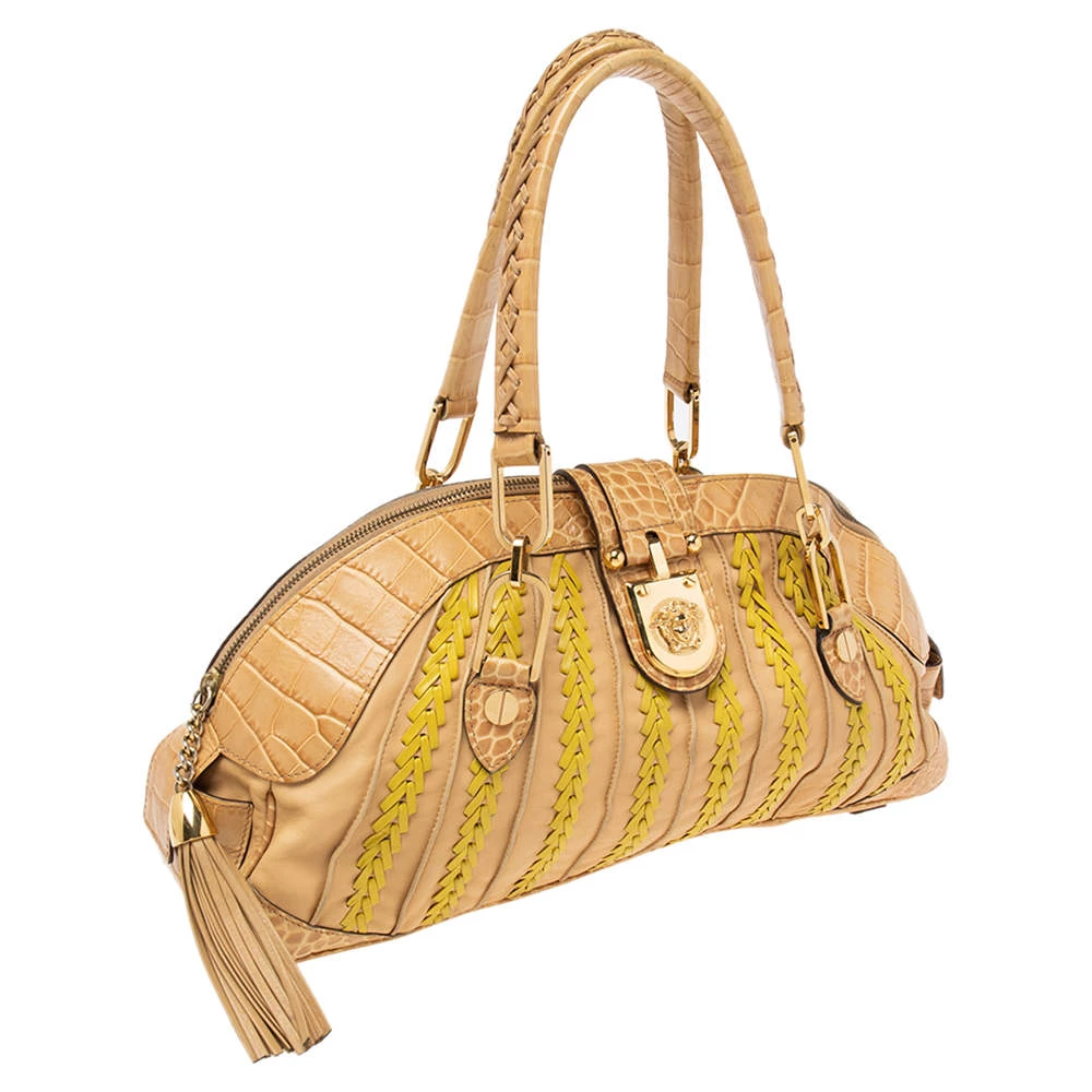 This bowler bag from the House of Versace is great for everyday use! It is made from beige-yellow leather and croc-embossed leather, which is embellished with gold-tone hardware. It showcases dual handles and a satin-lined interior. This bag will make you look classy!