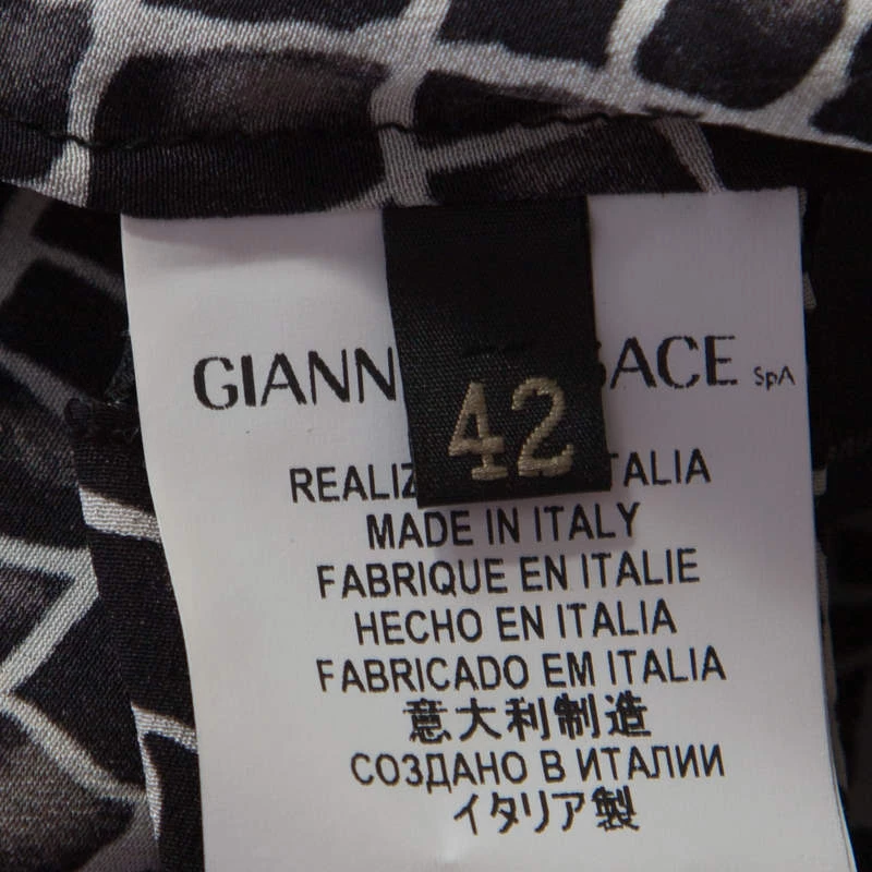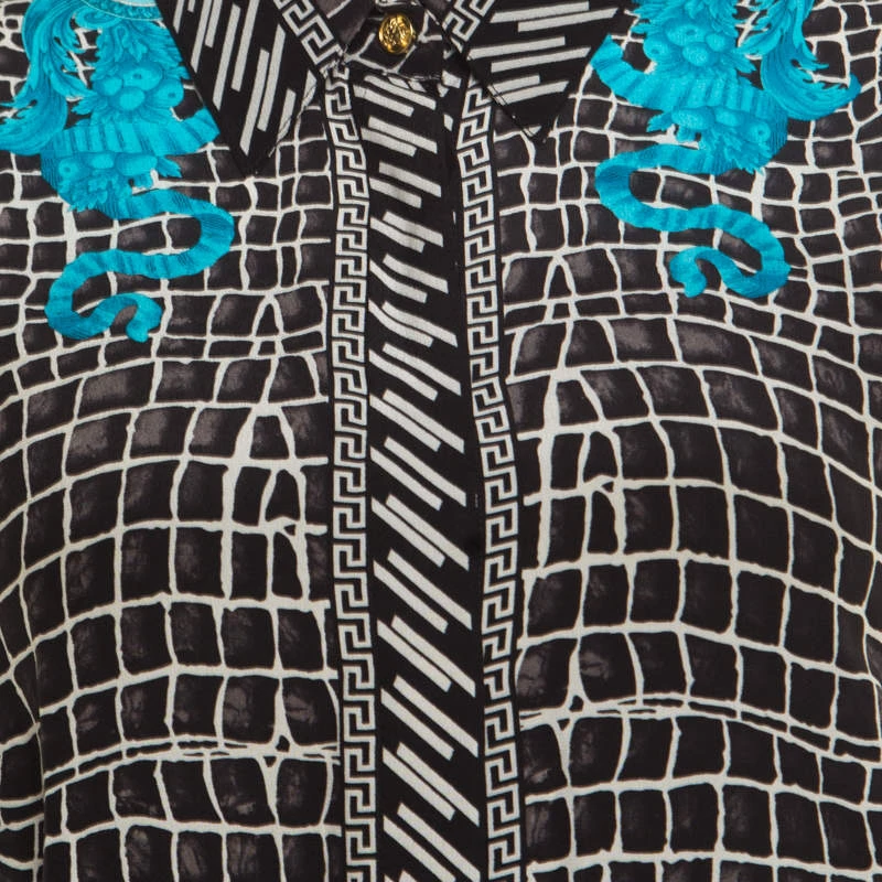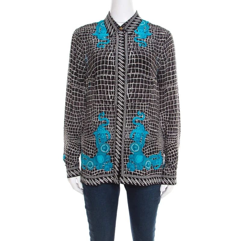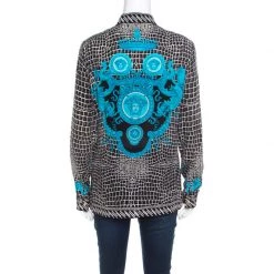Versace will never fail to impress others and it is fully proved by this designer silk blouse. It has a buttoned front, a classic collar and long sleeves. The abstract print along with the signature Medusa logo at the rear looks stunning on this blouse.