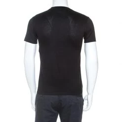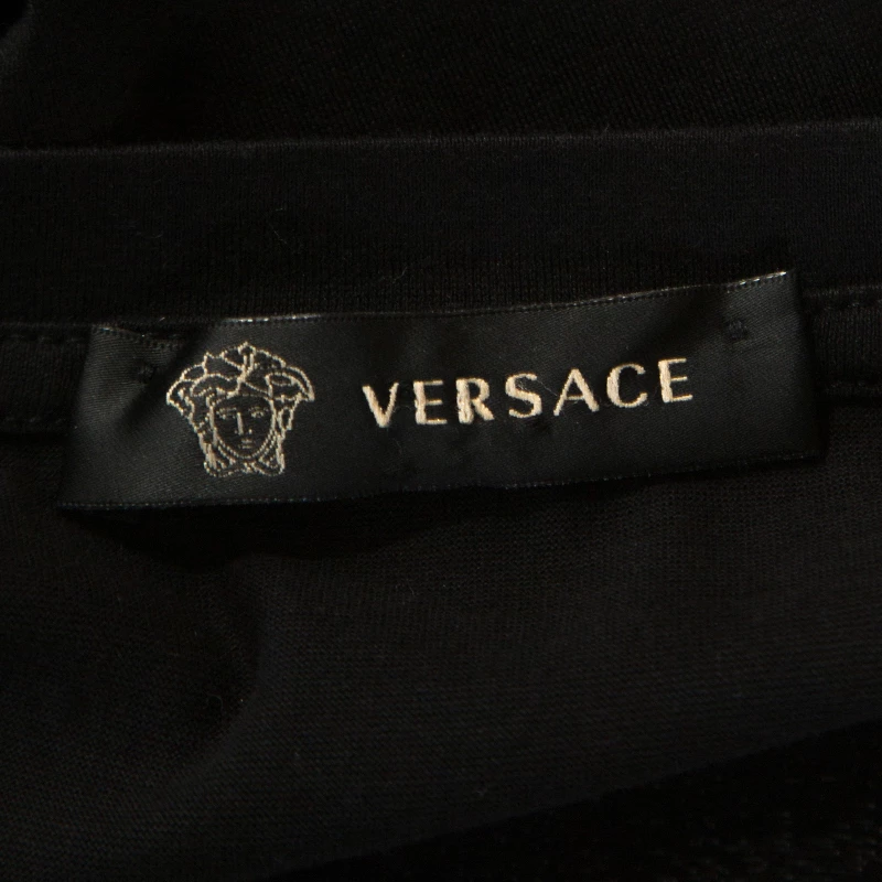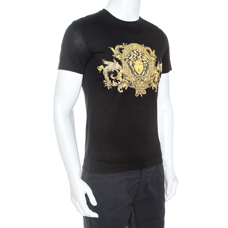 This stunning t-shirt by Versace is crafted from 100% cotton. It comes in a black shade and features a baroque print with the signature Medusa motif and subtle embellishments. It comes with short sleeves, round neck and has a good fit. Wear with jeans for a casual look.