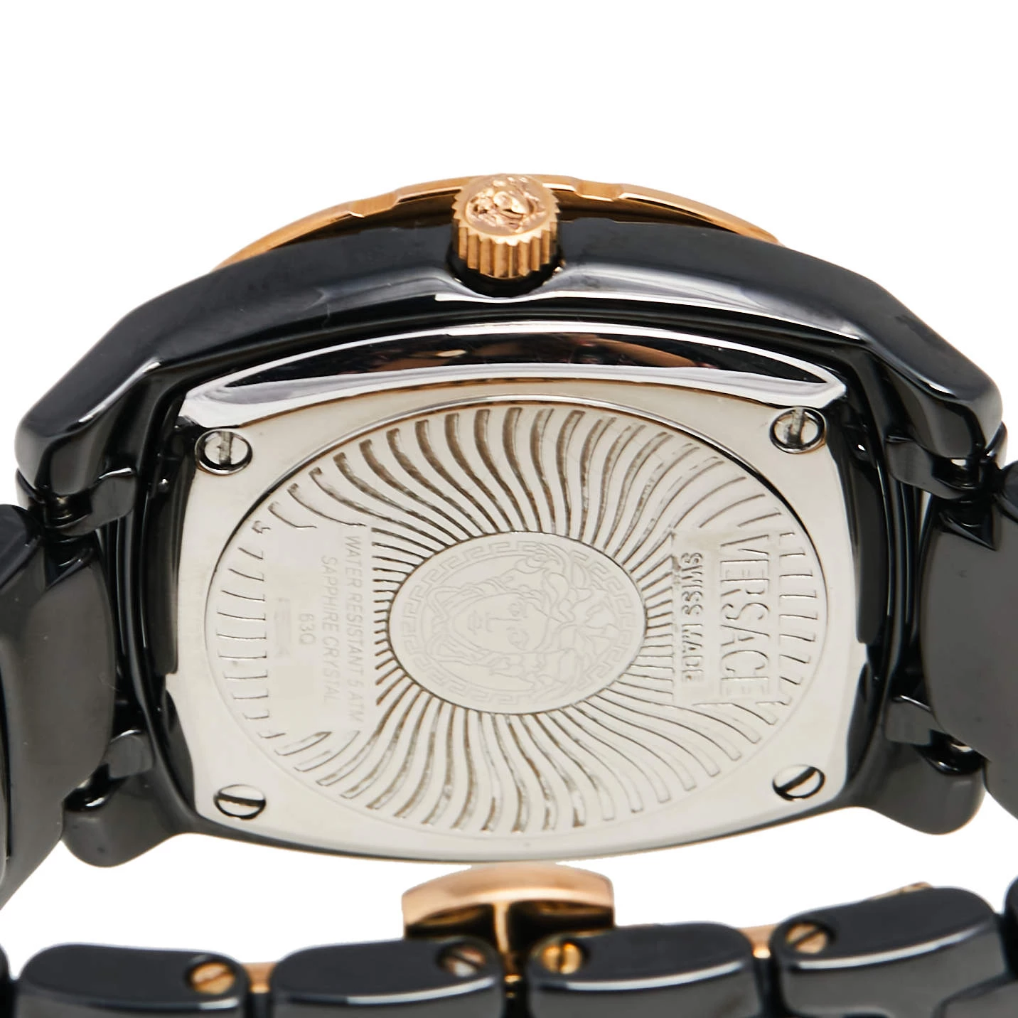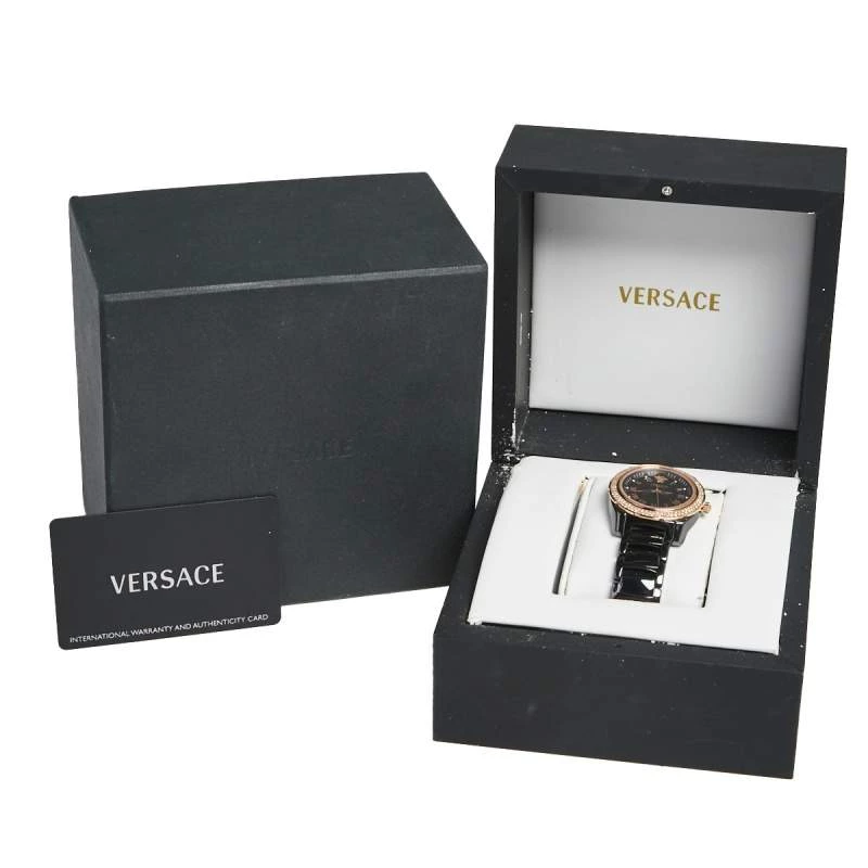 If you are looking for a utility wristwatch infused with immense timeless appeal, then this timepiece from Versace will serve you well. The watch offers the perfect combination of watchmaking technology and refined style for durability and aesthetic appeal. The black ceramic and rose-gold stainless steel case is fitted with a black dial featuring diamond and Roman numeral hour markers and the Medusa logo. For added shine, more diamonds are detailed on the bezel. The ceramic bracelet fixes on the wrist of the wearer with a push-button clasp.
