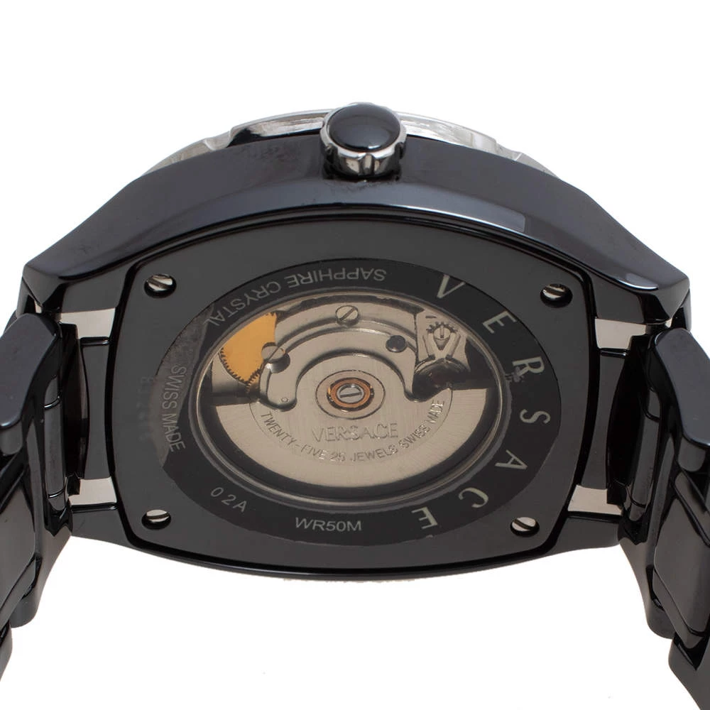 The Versace DV One 02A timepiece is a delight for watch lovers. Functioning on automatic movement, the watch has a black ceramic and stainless steel case with a diameter of 40 mm. While the bezel is detailed with the signature Greek keys, the dial boasts of stick and diamond hour markers, three hands, the iconic Medusa logo at the 12 o’clock position, and a date window at the 3 o’clock position. The case is neatly held by a black ceramic and stainless steel bracelet that fastens with a push-button deployment clasp.