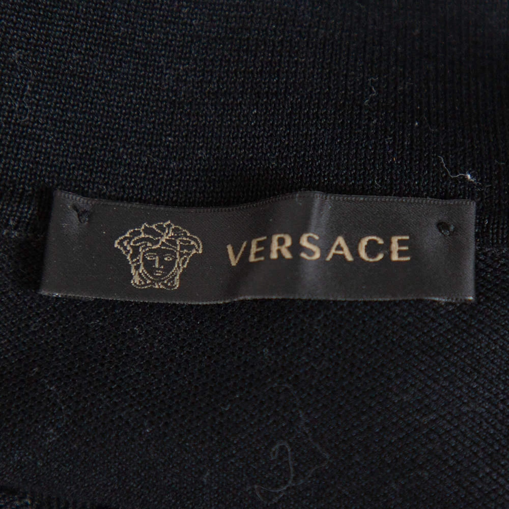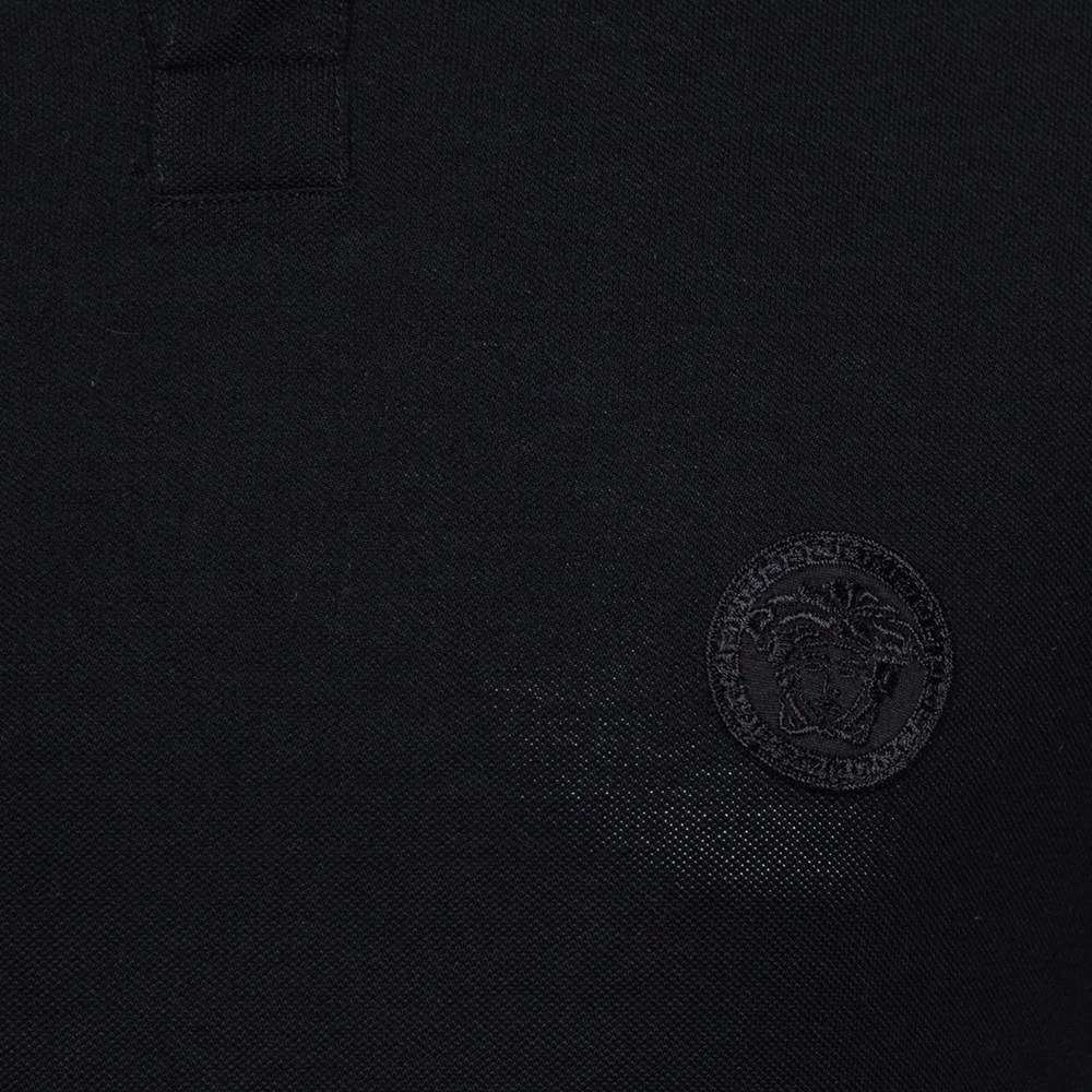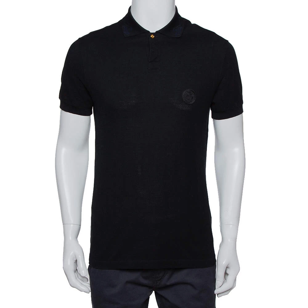 This Polo T-shirt from Versace offers an amazing fit! It is made of 100% cotton and features the classic collars with a contrasting design pattern, the iconic Medusa logo detailing on the front, short sleeves, and button fastenings. It will look best with casual jeans and sneakers.