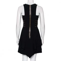 Start your evening on a classy note as you step out in this breathtaking short dress from Versace. Characterized by its impeccable eyelet leather trim detail, this black crepe dress will look unique every time you wear it. Pair this dress with black pumps and look mesmerizing.