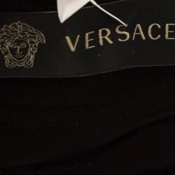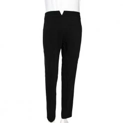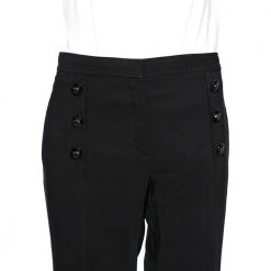 Look stylishly formal and neat as you wear these trousers designed by Versace. These trousers are tailored using black crepe fabric and exhibit a pleated logo-button detail on the front. It offers two external pockets. Style with your favorite blouse and pumps to attain a polished look.