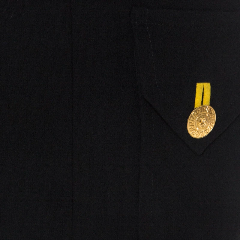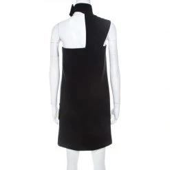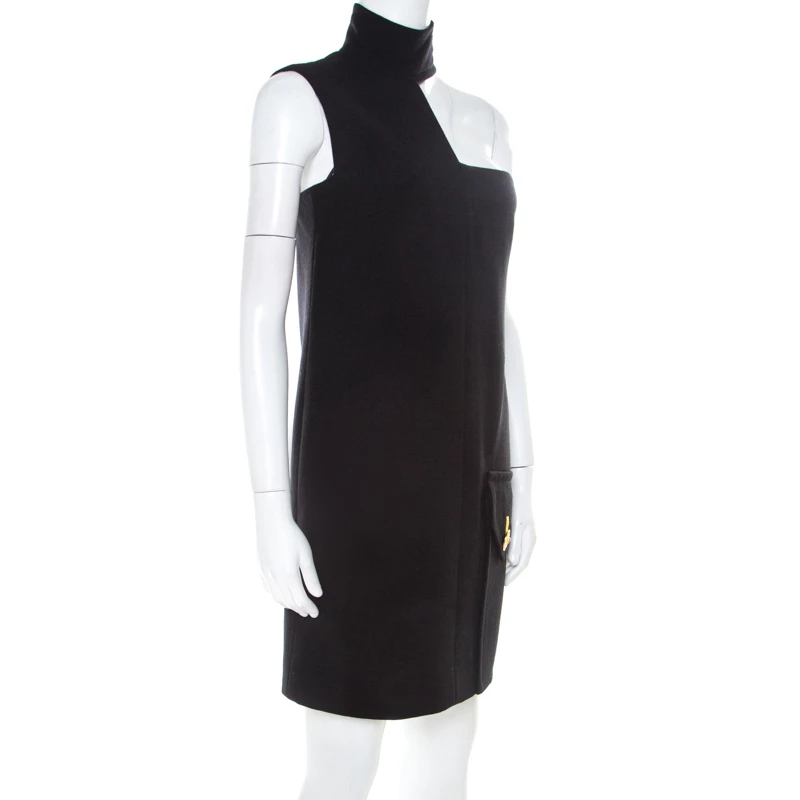 Words fall short to describe this shift dress from Versace. It is made from wool and designed with an asymmetric cut on one of the shoulders. The black dress has a zip closure and the neck cuff is held by buttons.