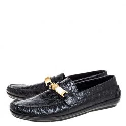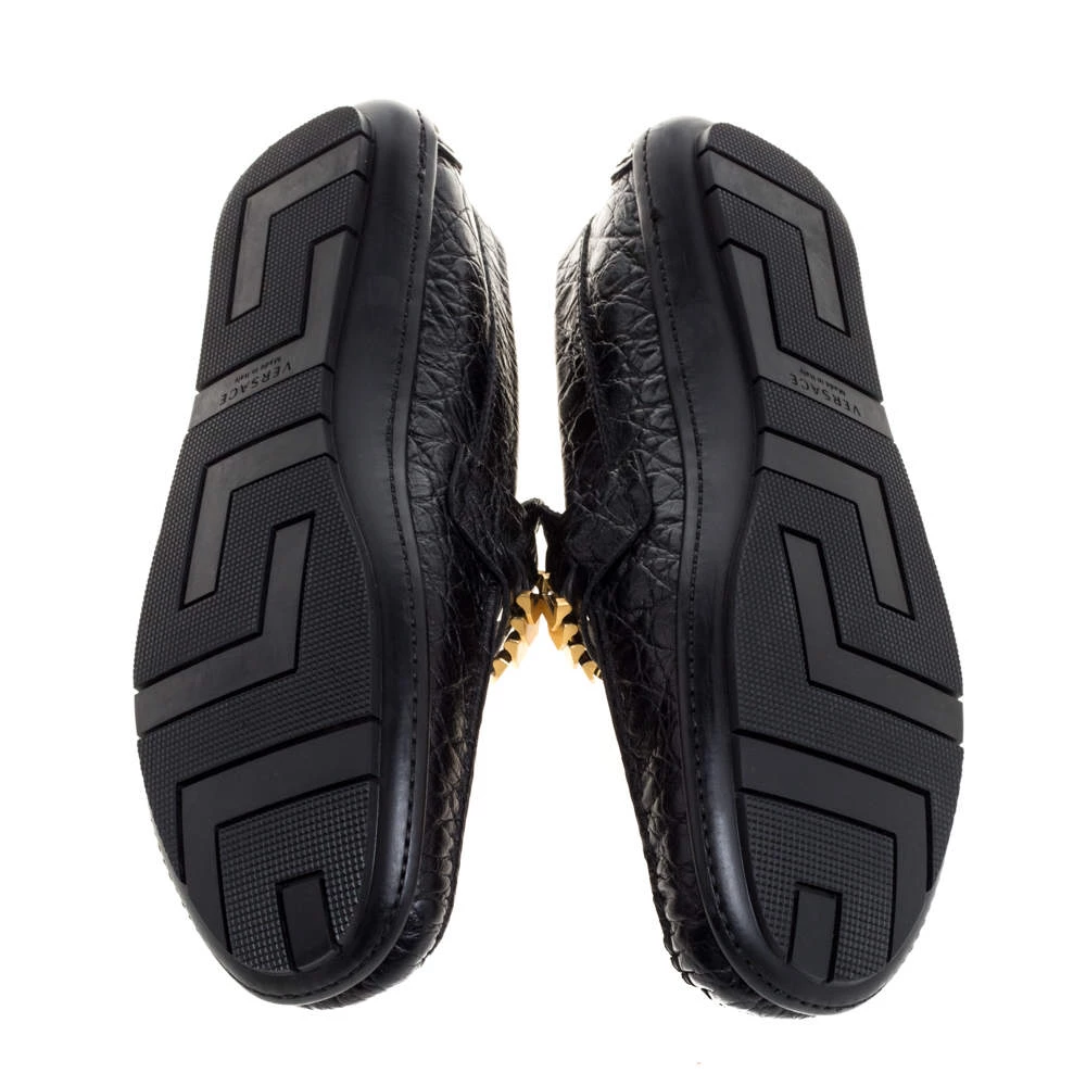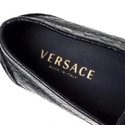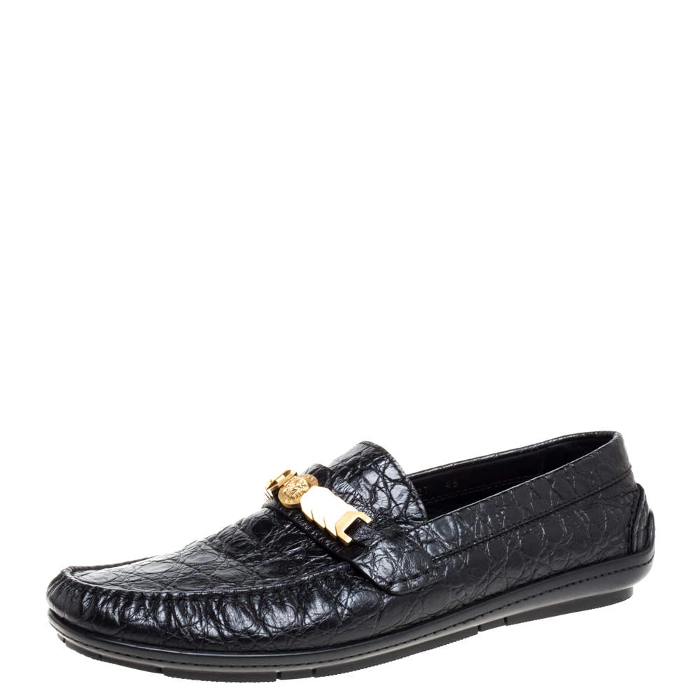 Incredibly stylish and statement-making, this pair of loafers from Versace is worth owning! The black loafers are crafted from croc-embossed leather and feature round toes. They have been styled with the signature gold-tone Medusa logo and chain detailed straps on the vamps and come endowed with comfortable insoles. They are complete with tough rubber soles.