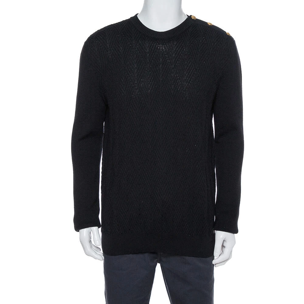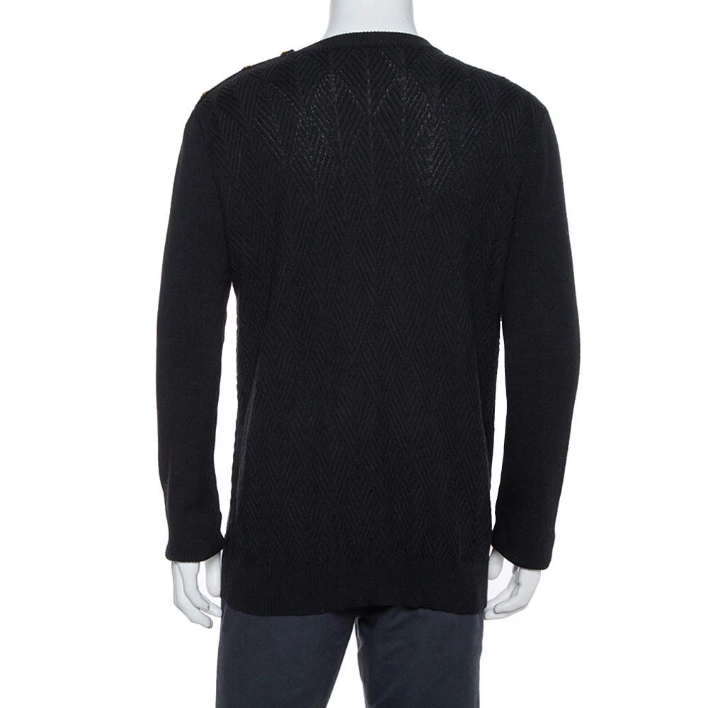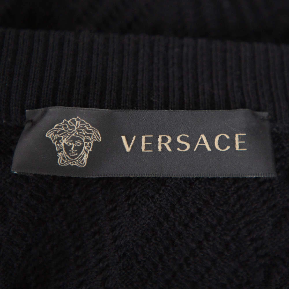 A warm, comfortable sweater by Versace that you can add to your winter wardrobe. Knit from wool, the sweater has diamond patterns in a classic black shade. The creation has long sleeves and a crew neckline.