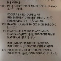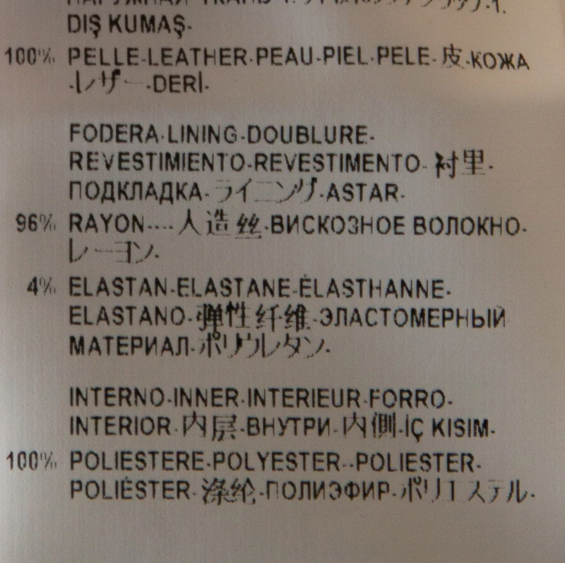 - Fabric: Shell: 100% Leather ; Interior: 100% Polyester ; Lining: 96% Rayon, 4% Elastane