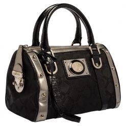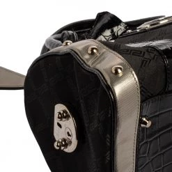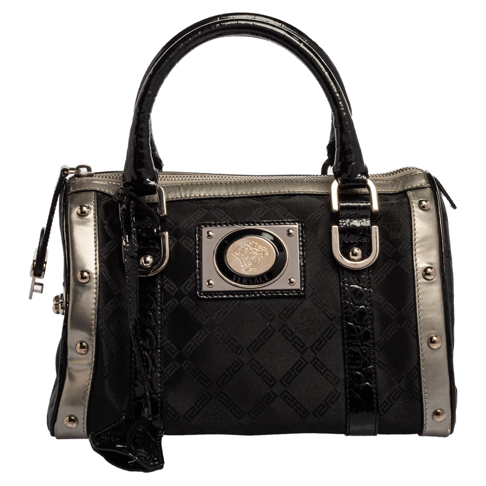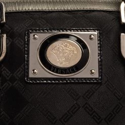 This Versace satchel is a symbol of style and reliability. This black bag is crafted from fabric and leather. It is equipped with a wel-sized nylon interior, two handles, and silver-tone hardware.