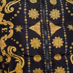 Enhance your outfit with trendiness and style as you wear this Versace creation. Featuring signature Baroque prints, this puffer-down jacket is tailored using black-gold fabric and complemented with long sleeves. It is equipped with a hoodie, a zipper fastening, and two pockets. Flaunt a classy look by wearing this Versace jacket.