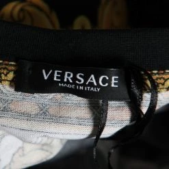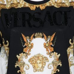 With its signature design, this top from Versace will be your favorite pick! It is designed using black-gold cotton fabric, highlighted with a crystal logo embellishment and a Medusa Renaissance print. It showcases short sleeves. Pair this top with contrasting trousers.