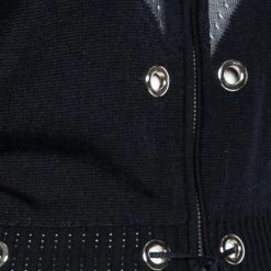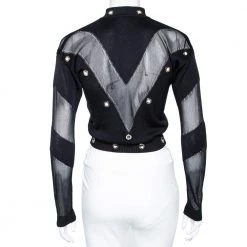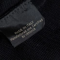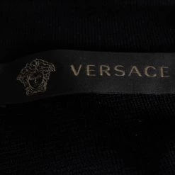 Coming from the House of Versace, this jacket is tailored luxuriously to grant nothing but class and charm. It is made from black-gold knit fabric, with eyelet embellishments elevating its appearance. It has a zip-front feature along with long sleeves. Add this Versace creation to your collection today!