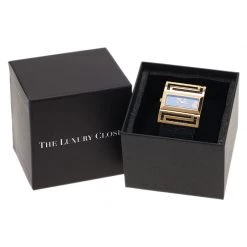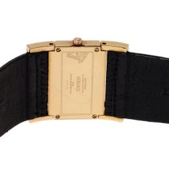Stand out with this slick Versace wristwatch. Made from Gold-plated stainless steel, the horizontal rectangular case holds a beveled bezel with the meander pattern on the top and bottom sides. Its black dial is contrasted with gold-tone hour indexes and Roman numerals and hands. Its right and left sides hold the Versace logo and an outlined design of the Medusa insignia. Featuring a 30m water resistance level, this quartz watch has a wide and embossed leather band with an engraved buckle closure.