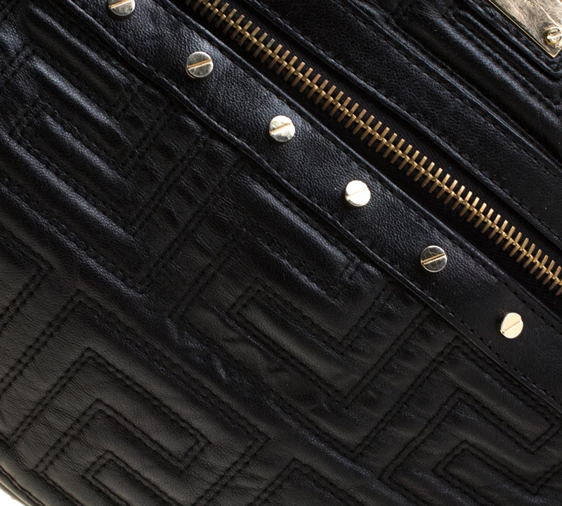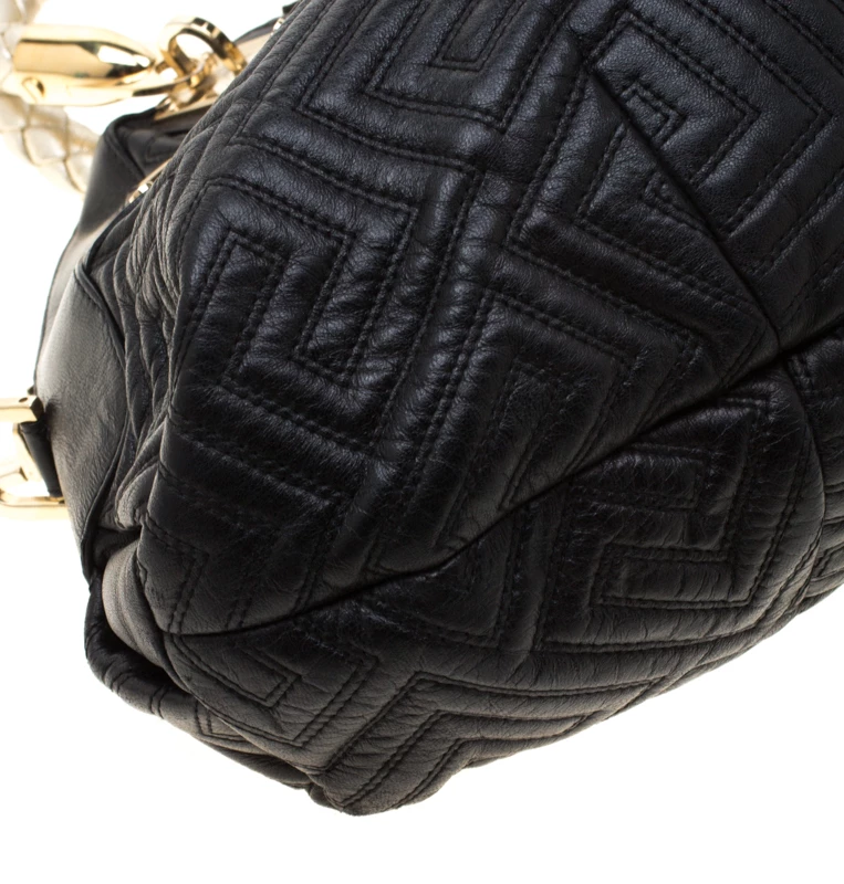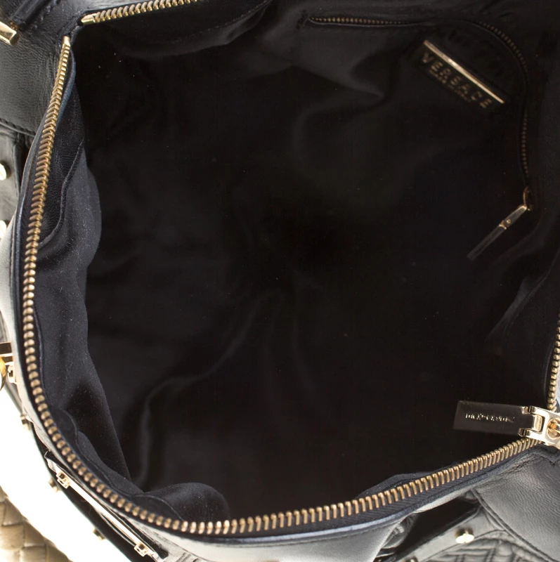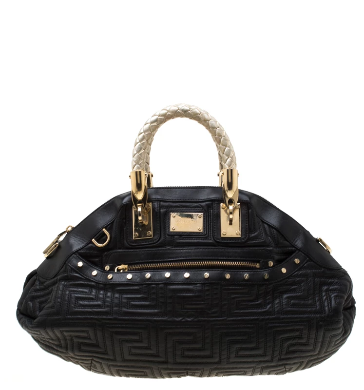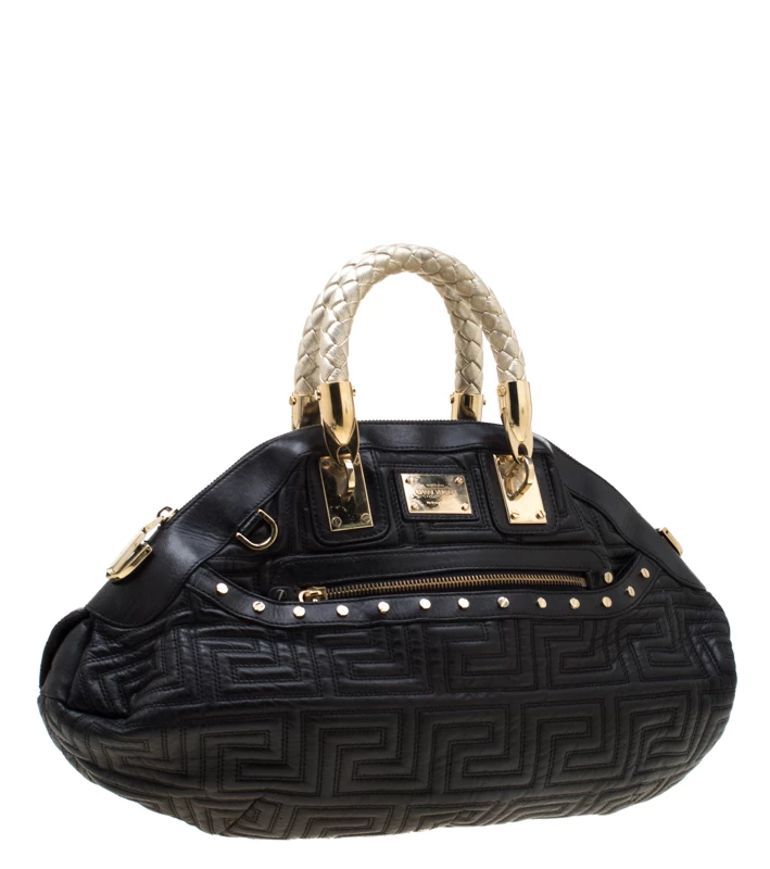 This Versace satchel carries an outstanding design and a fabulous interplay of leather and gold-tone hardware. It has a top zipper leading to a satin interior while being held by two braided handles. The quilt detailing and the brand label on the front just uplift its beauty.