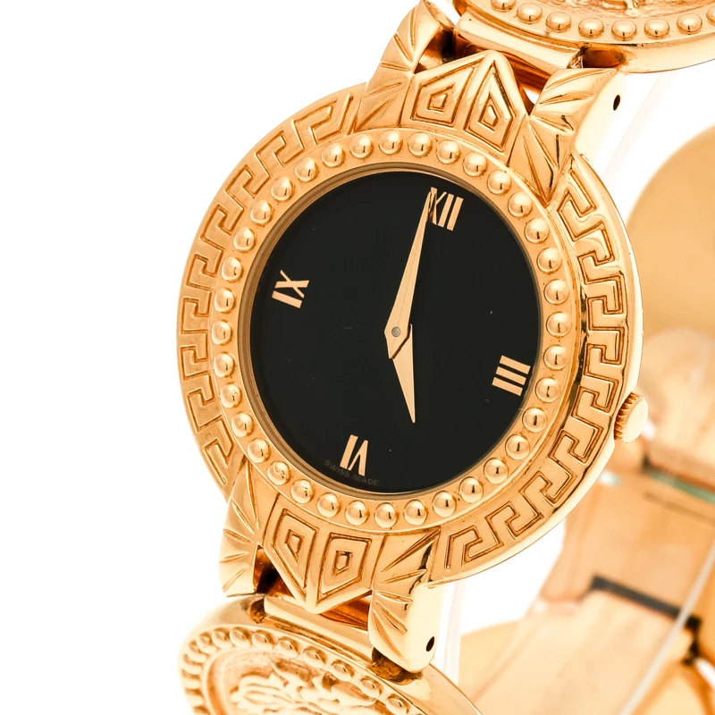 At first glance, one would think this piece is a bracelet, but it is actually a wristwatch. It is such a versatile creation. Made from gold-tone metal and held by a bracelet decorated with the brand’s signature Medusa, the watch is gorgeous. On its black dial sits three Roman numeral hour markers and two sharp hands, while signature engravings are laid on the bezel. There is no reason why you should not own this Versace.
