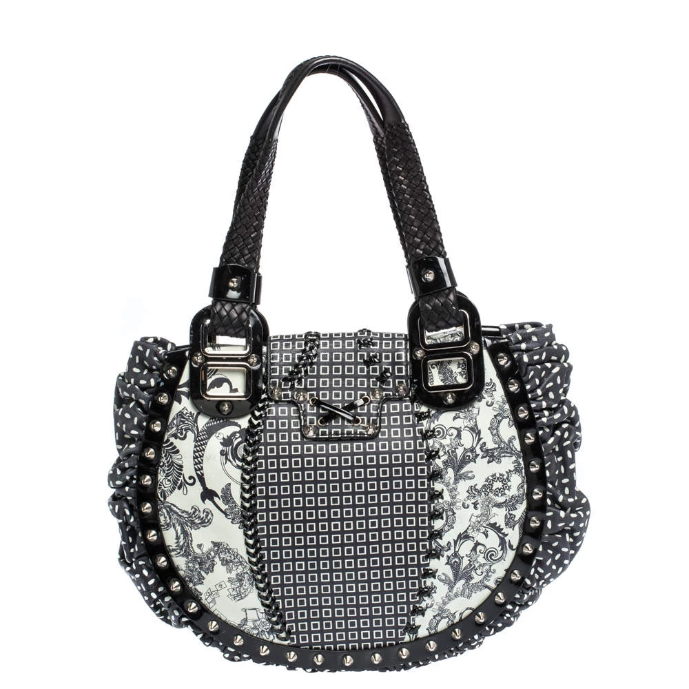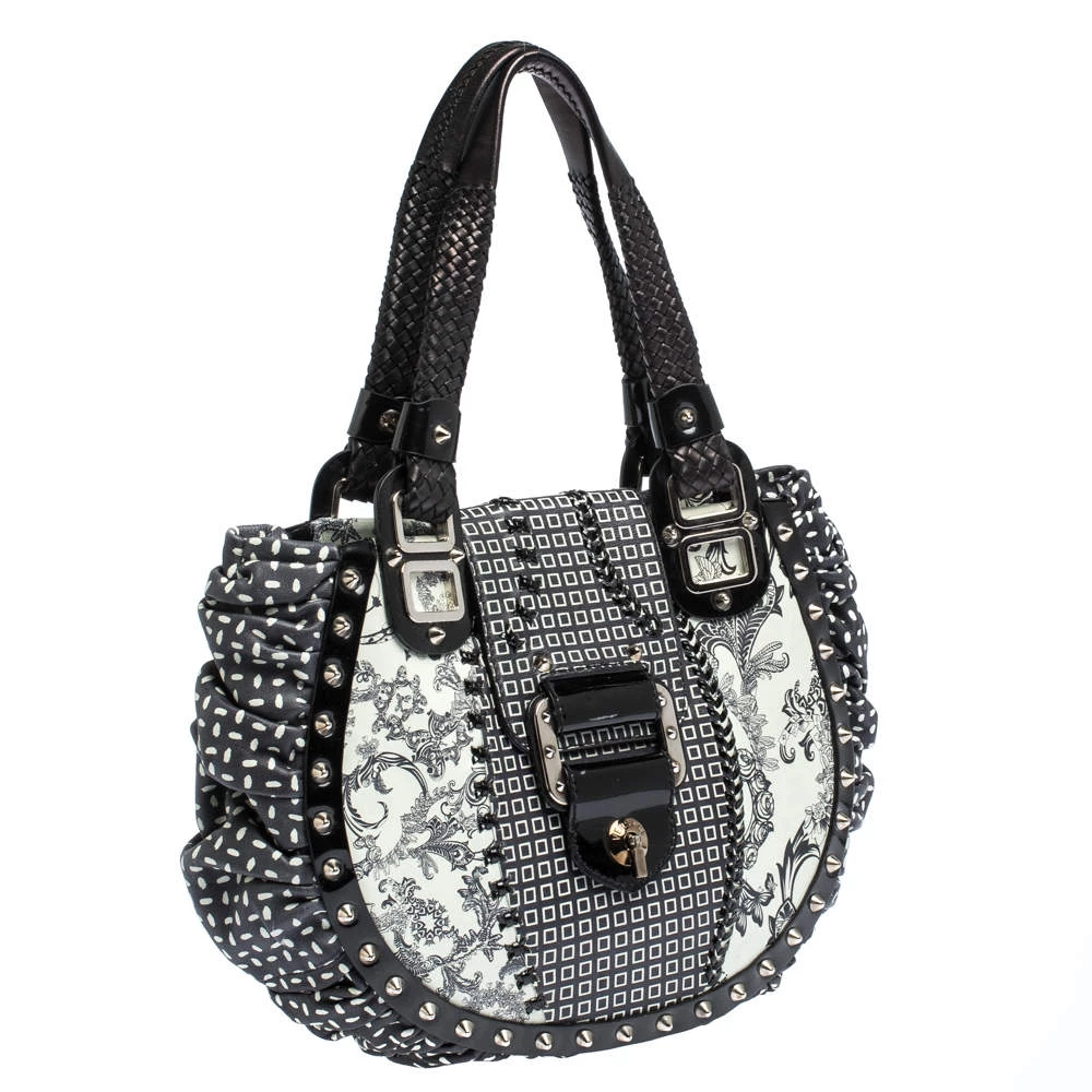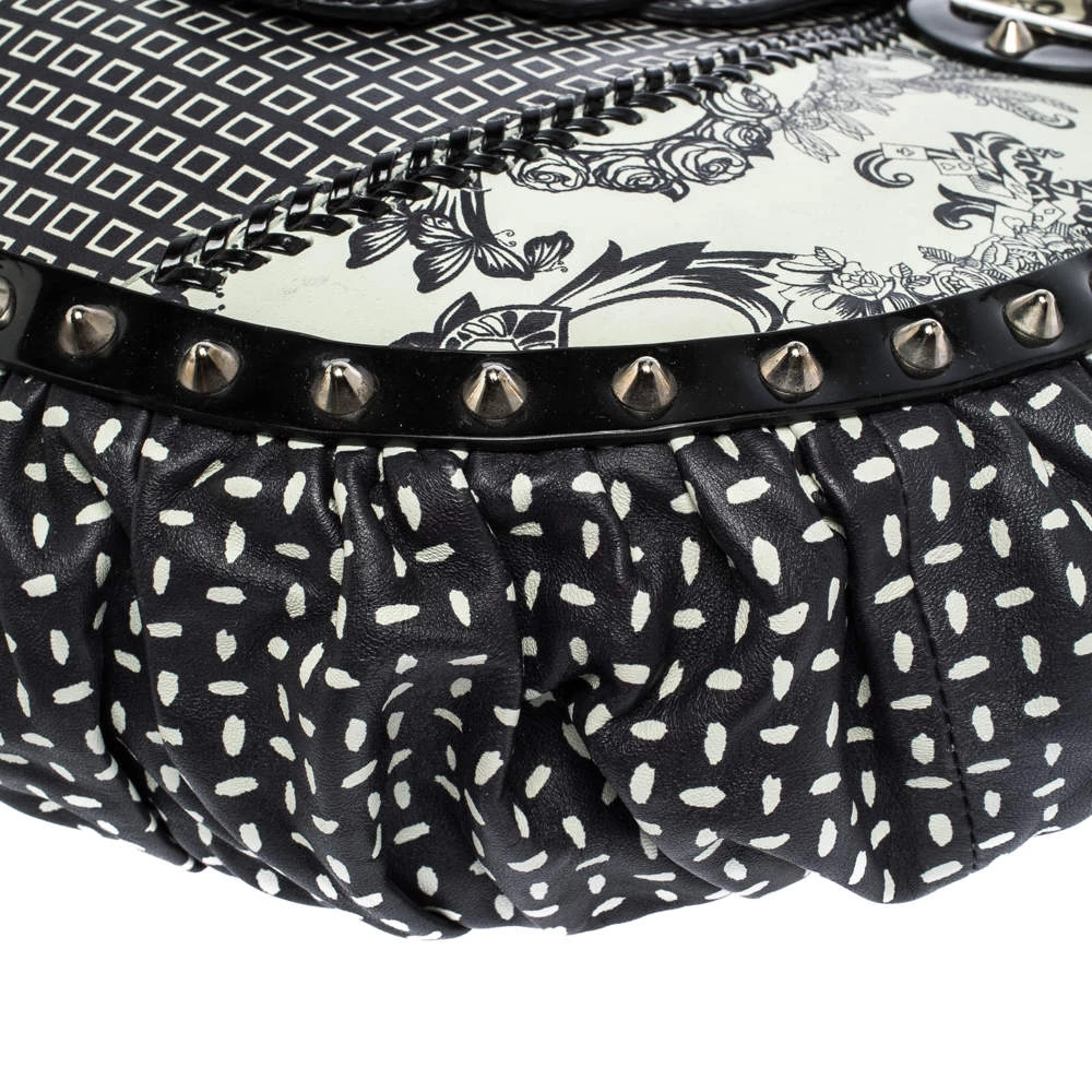 Elevate your everyday look by carrying this sleek handbag from Versace. Dress up like a style icon when you pair this black & green hobo with your outfits. Crafted from ruffled printed leather, it has a front flap, dual handles, silver-tone hardware detailing and studs and a spacious satin-lined interior with a zip pocket.