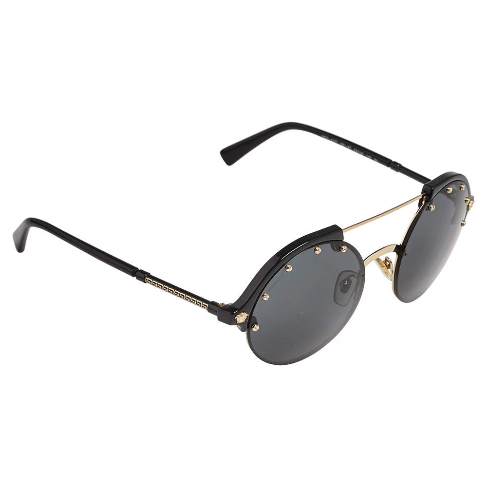 The round sunglasses by Versace have a distinct look that makes them glamorous and stylish at the same time. Flaunting a smart design with acetate and metal construction, this piece is paired with grey lenses to add a chic appeal and resist sun rays.