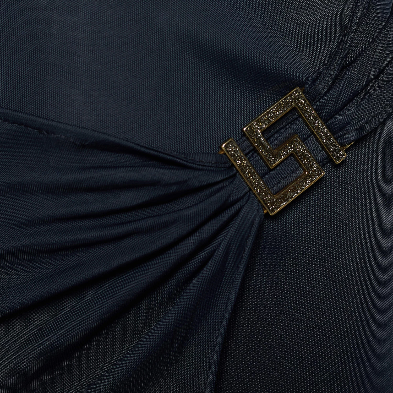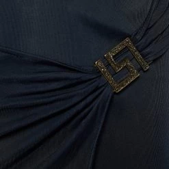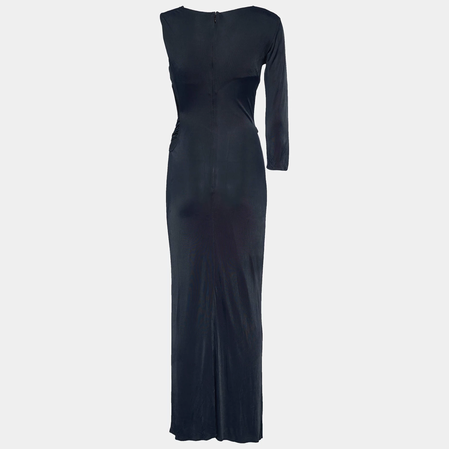 Versace’s dress is just the perfect pick to prepare for a dinner date or an evening party. Graced with cut-outs, this dress is cut from black jersey fabric and highlighted with drapes. It flaunts an embellishment on the front and a zipper for closure. With the right pair of heels, this dress will look absolutely gorgeous.
