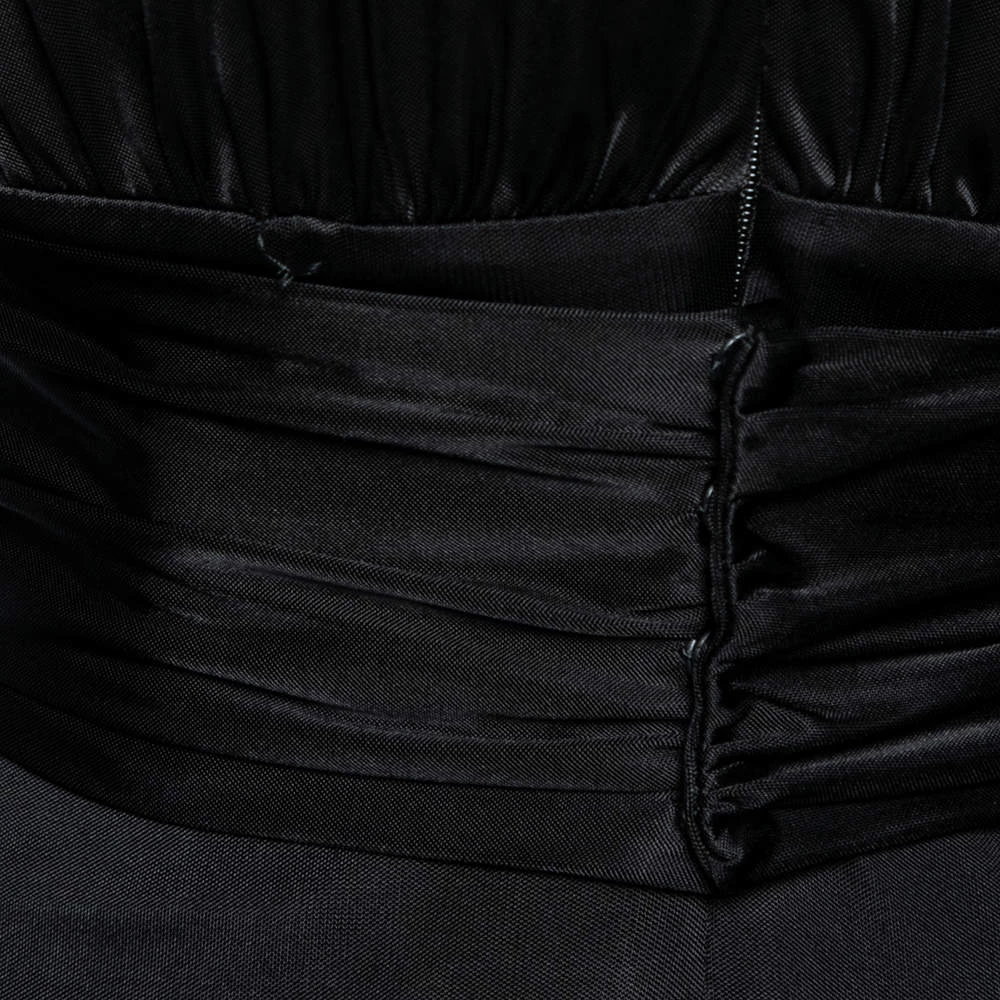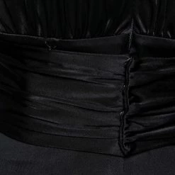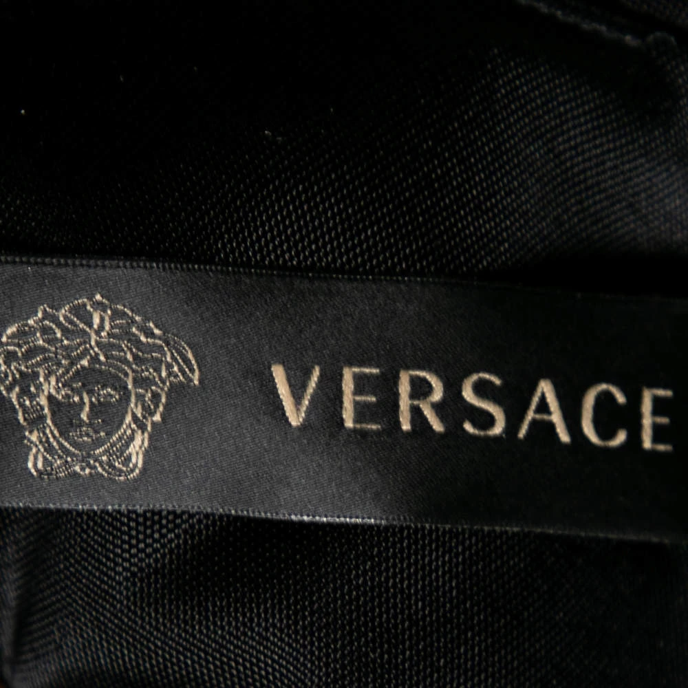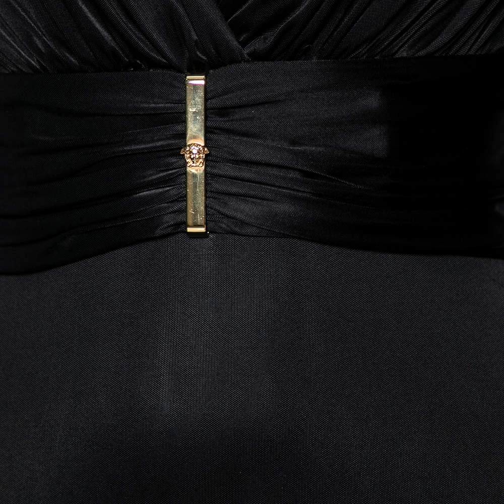 Bring Versace’s timeless charm and poise to your attire by flaunting this beautiful dress. It is fashioned in black jersey fabric into a well-fitted silhouette. It is accentuated with a steep V-shaped neckline, long sleeves, and a belted feature. Complement this stunning Versace dress with a black pair of pumps.