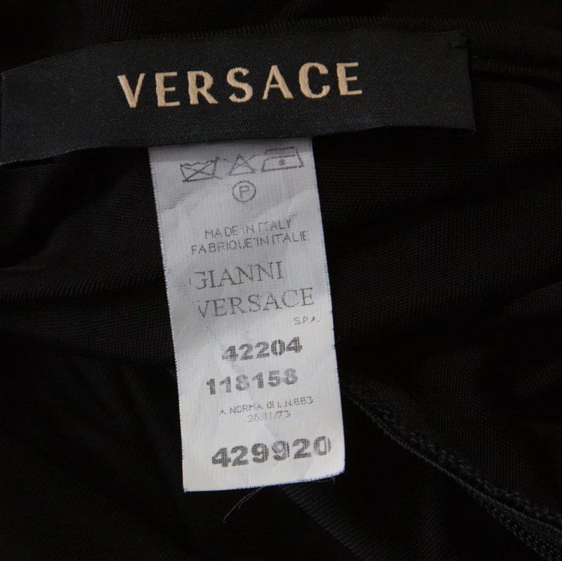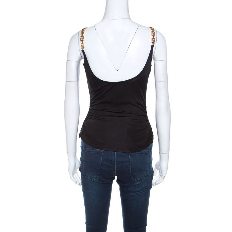 This is a classic and must-have top from Versace that lends some flair to your dressing. This splendid black piece with its gold-tone logo chain strap design is just too awesome for you to miss. This top will look good with a variety of bottoms.