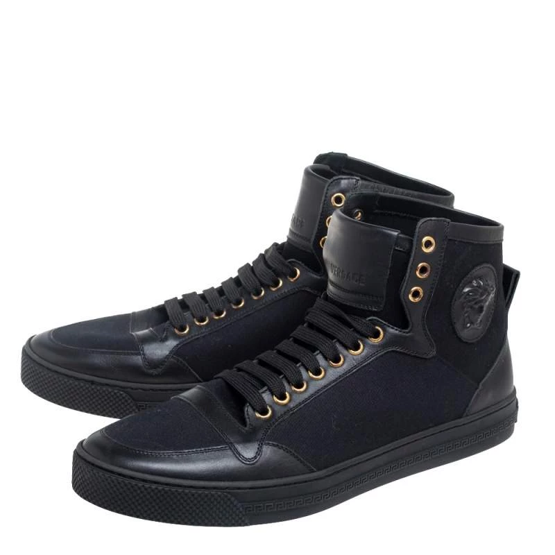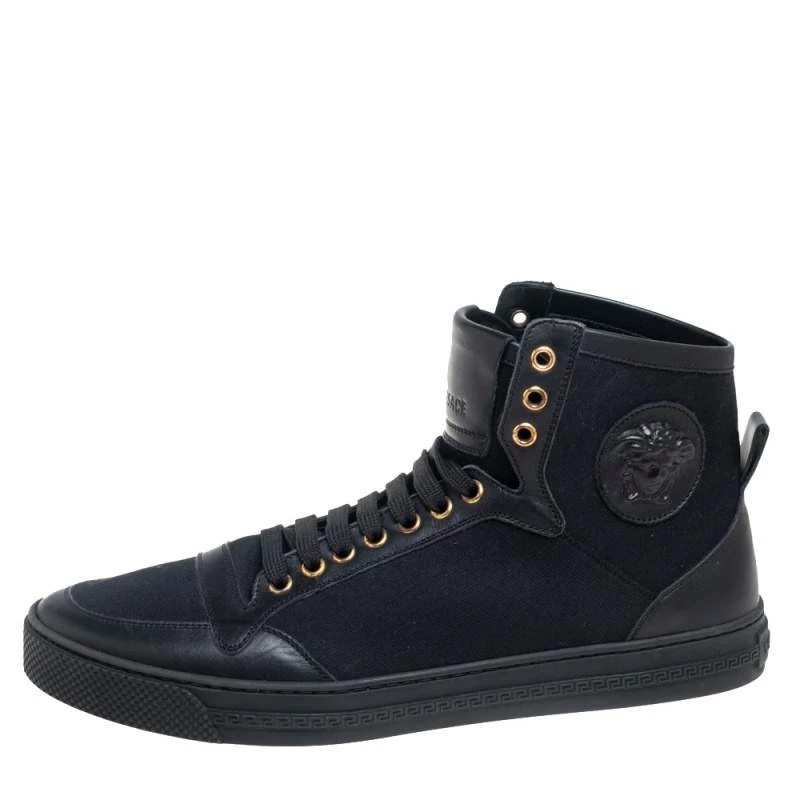 Coming in a classic high-top silhouette, these Versace sneakers are a seamless combination of luxury, comfort, and style. They are made from leather in a black shade. These sneakers are designed with the label’s logo on the sides, laced-up vamps, and comfortable insoles.