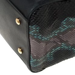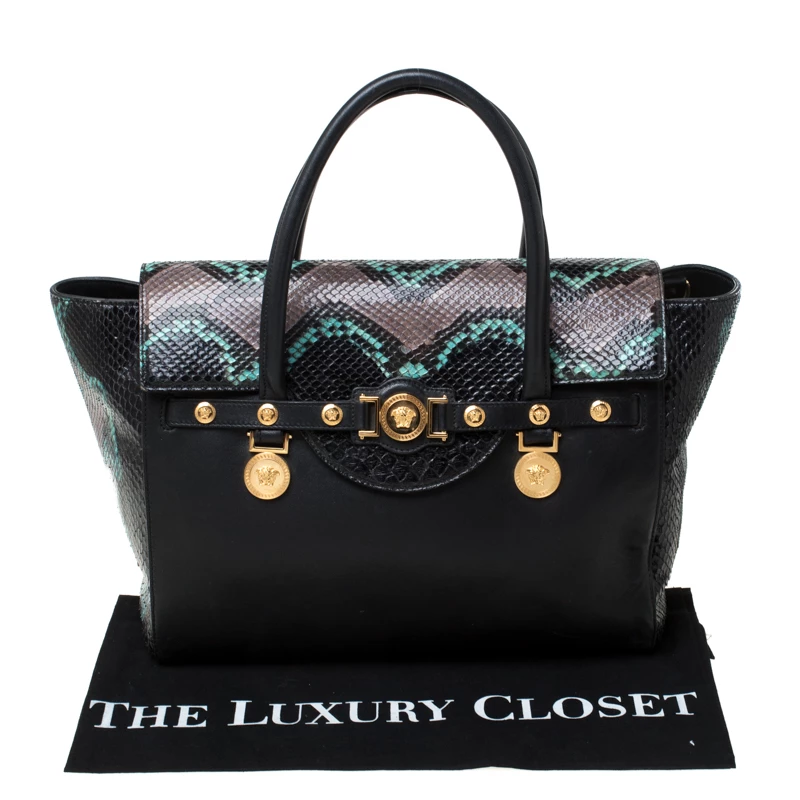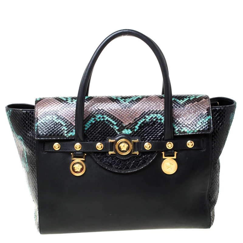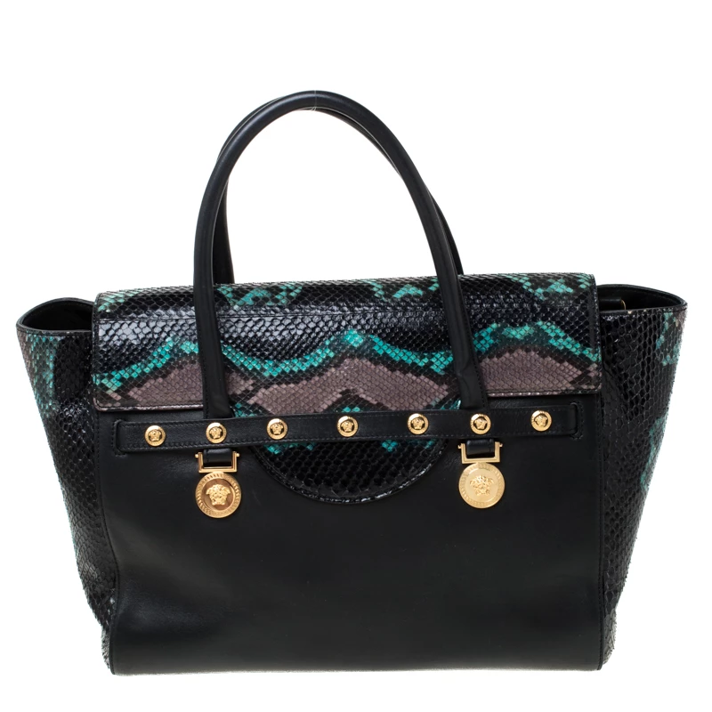 This top handle bag from Versace is a fabulous piece. The bag comes in a luxurious black exterior made from leather and enhanced with python embossing. The bag is designed with their signature Medusa motifs and a front flap that reveals a spacious satin interior. It features dual top handles and protective feet at the bottom. High on appeal and effortlessly stylish, this bag deserves to be in your arms.