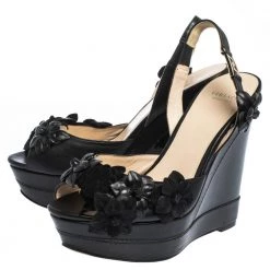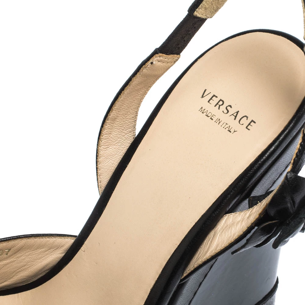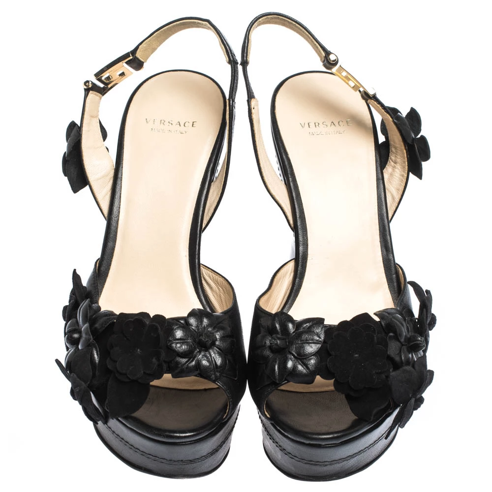 A perfect blend of comfort and high-fashion, these leather and suede sandals will sing in harmony with your style. The Versace sandals feature peep toes, flower details and slingbacks. They are balanced on wedge heels.