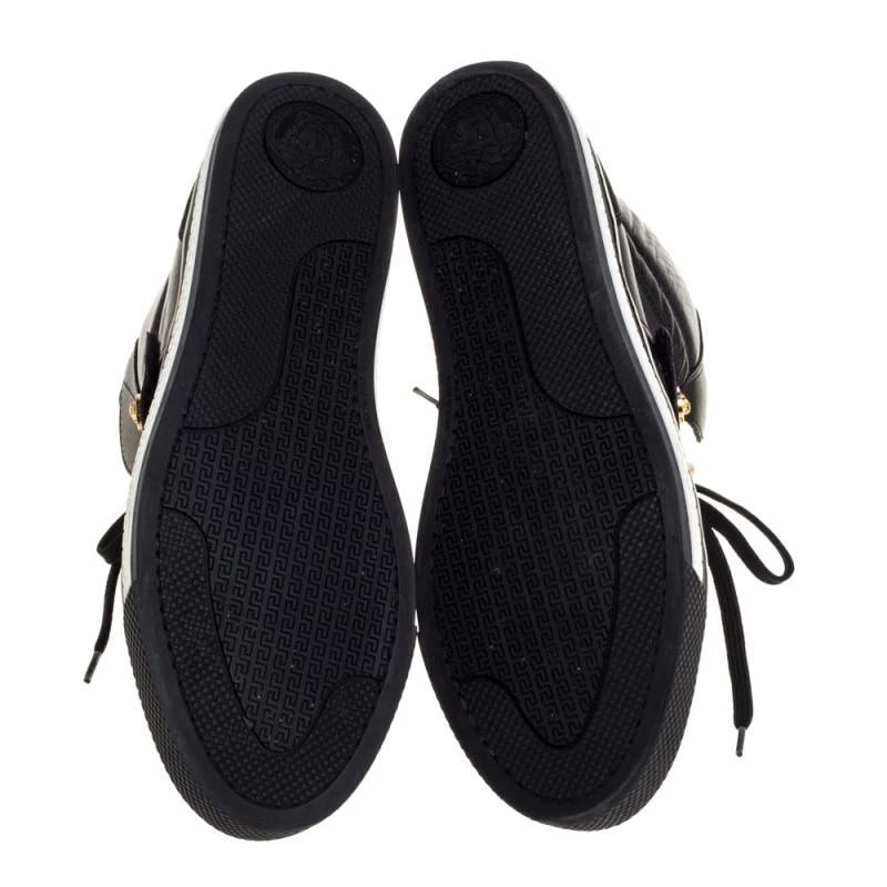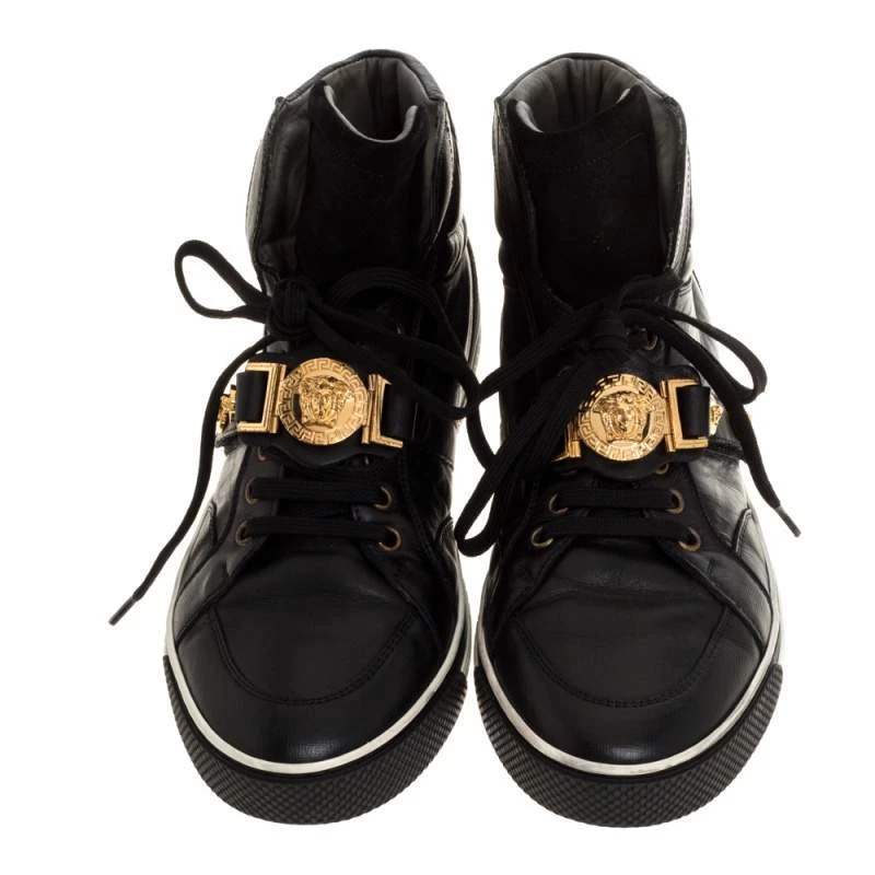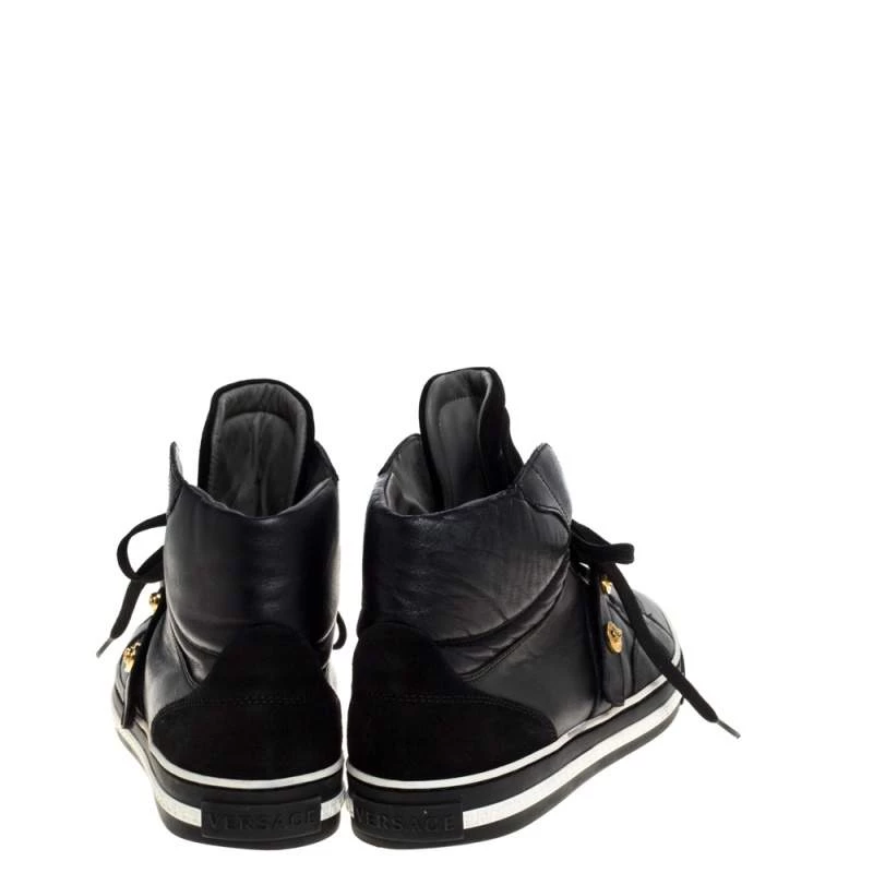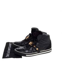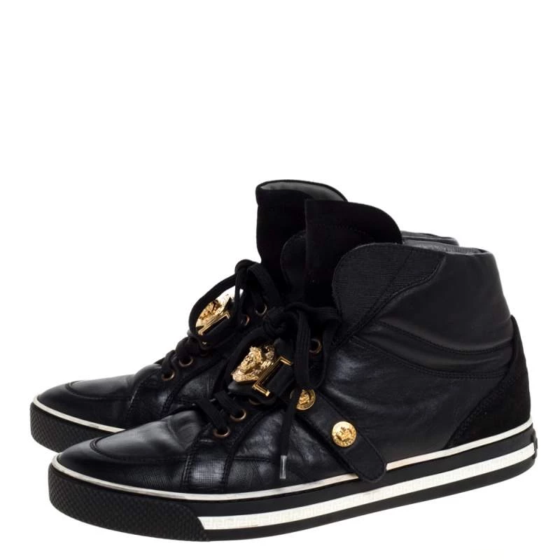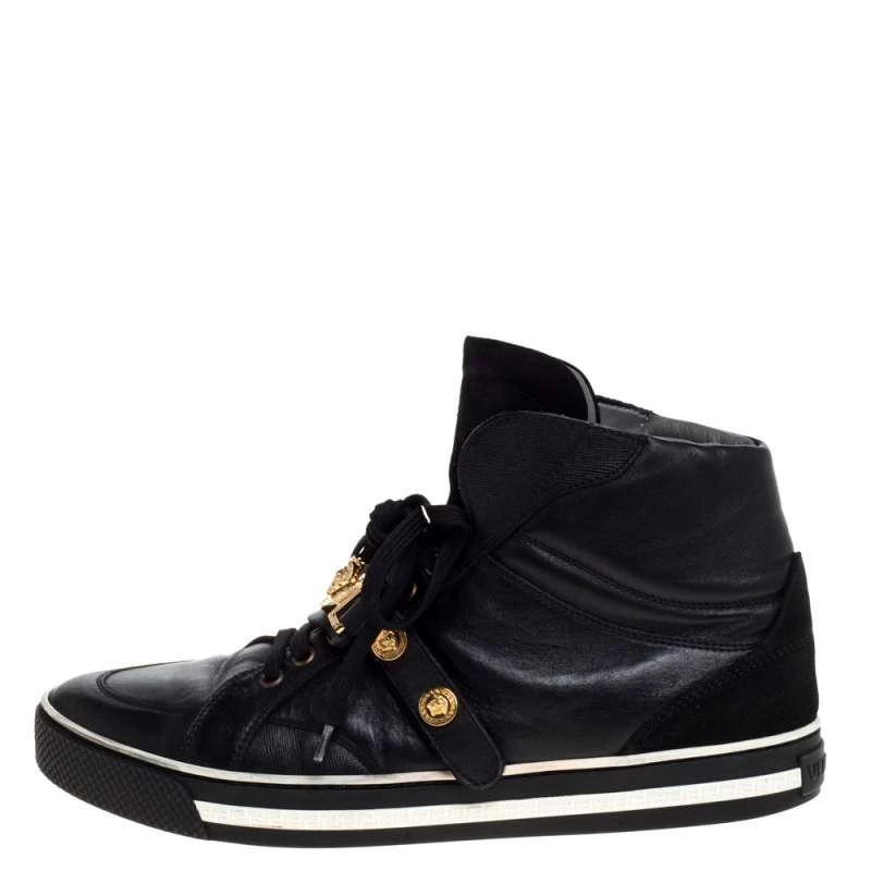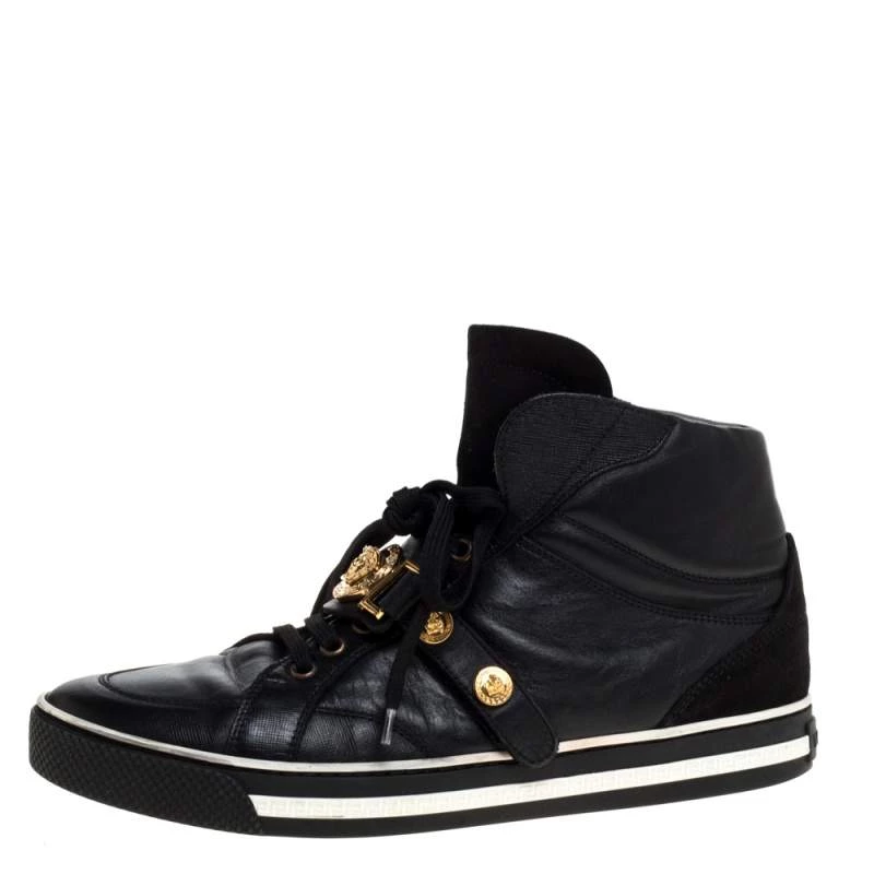 Brimming with fabulous details, these Versace sneakers are crafted from leather and suede into a high-top silhouette and feature lace-up vamps, gold-tone studs and the Medusa logo. Comfortable soles and a trendy appeal make these sneakers a must-buy.