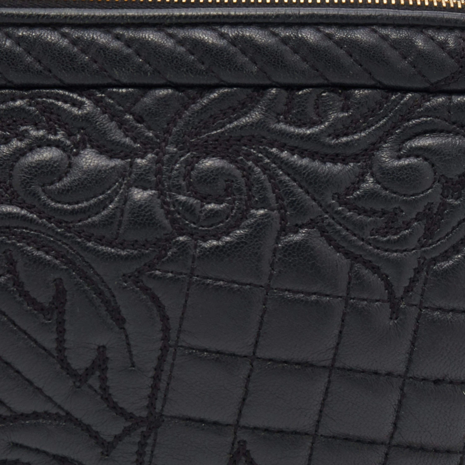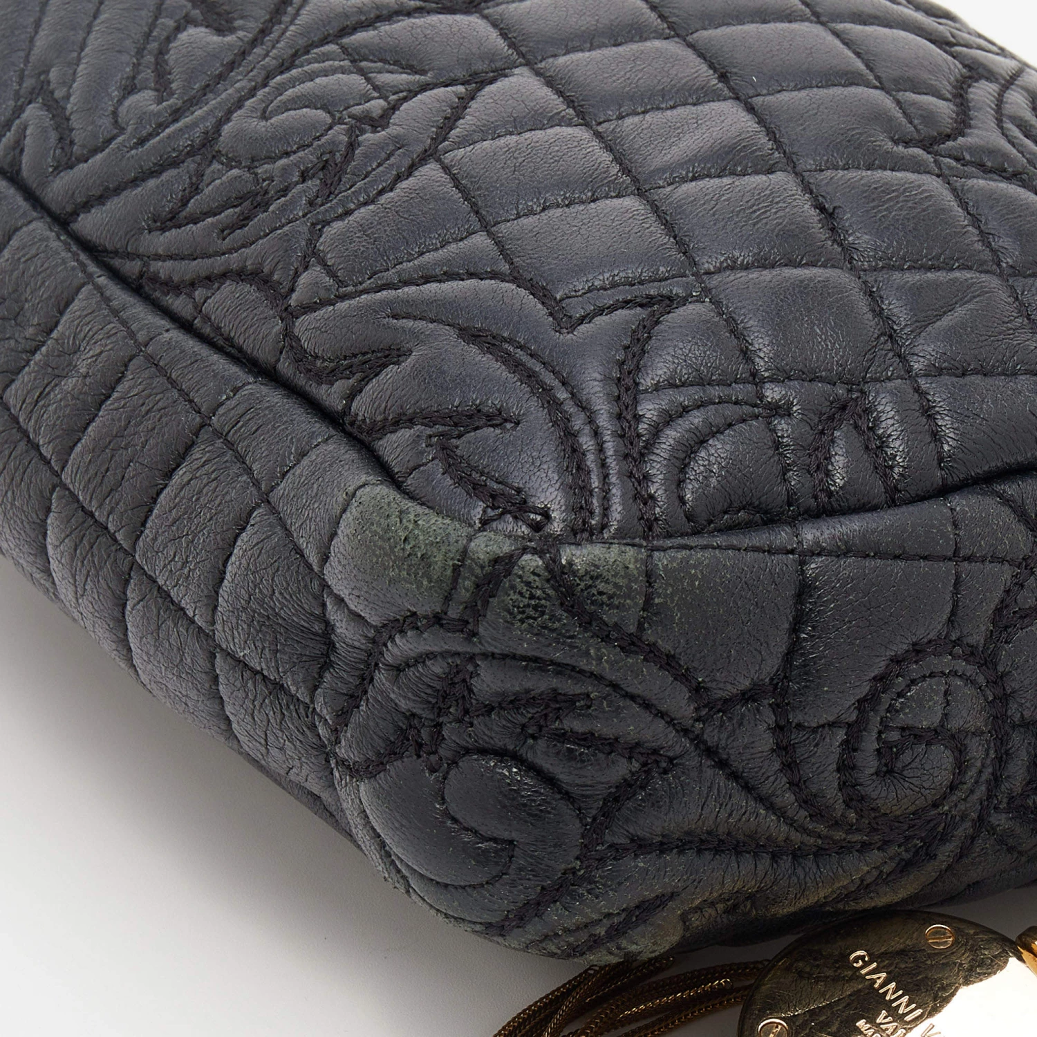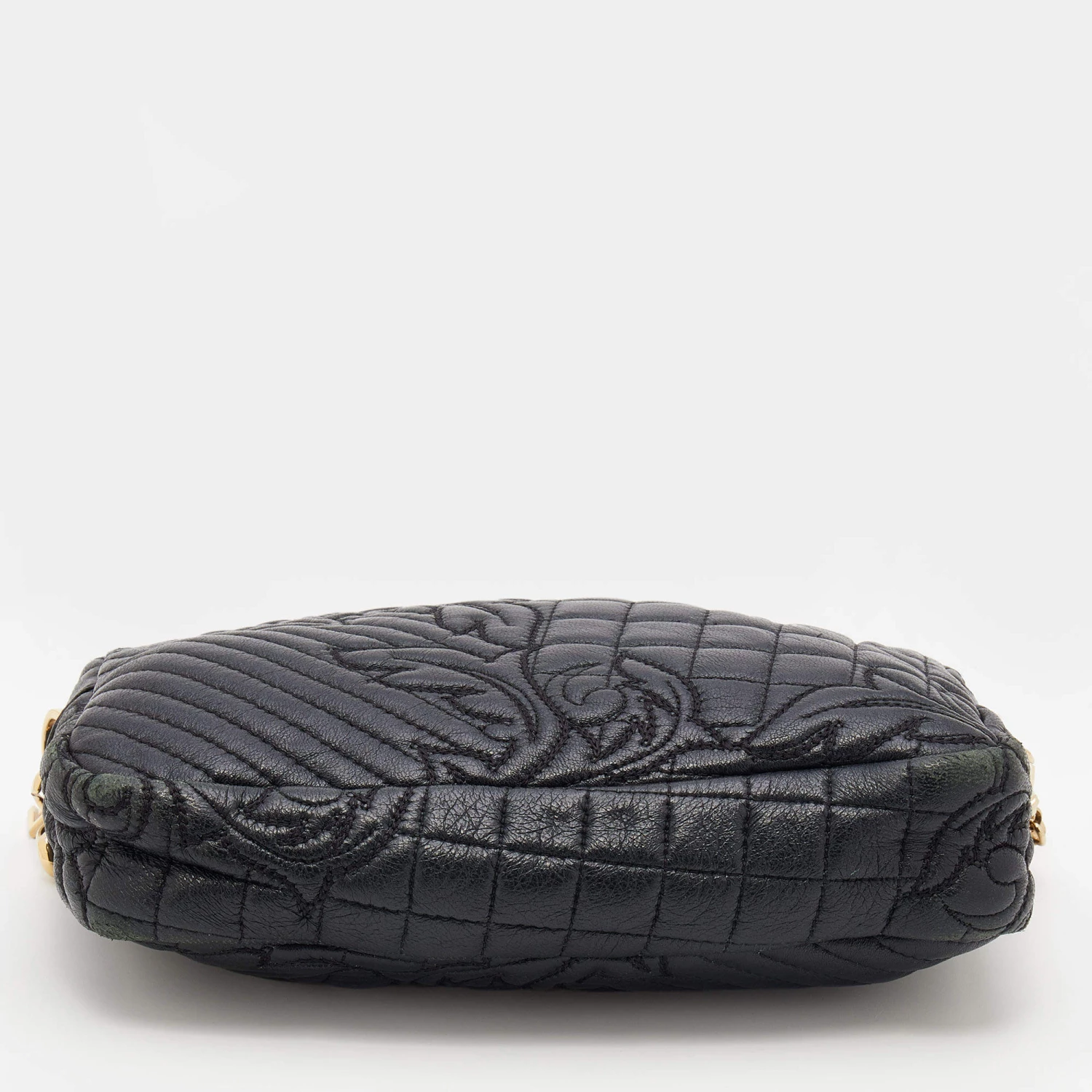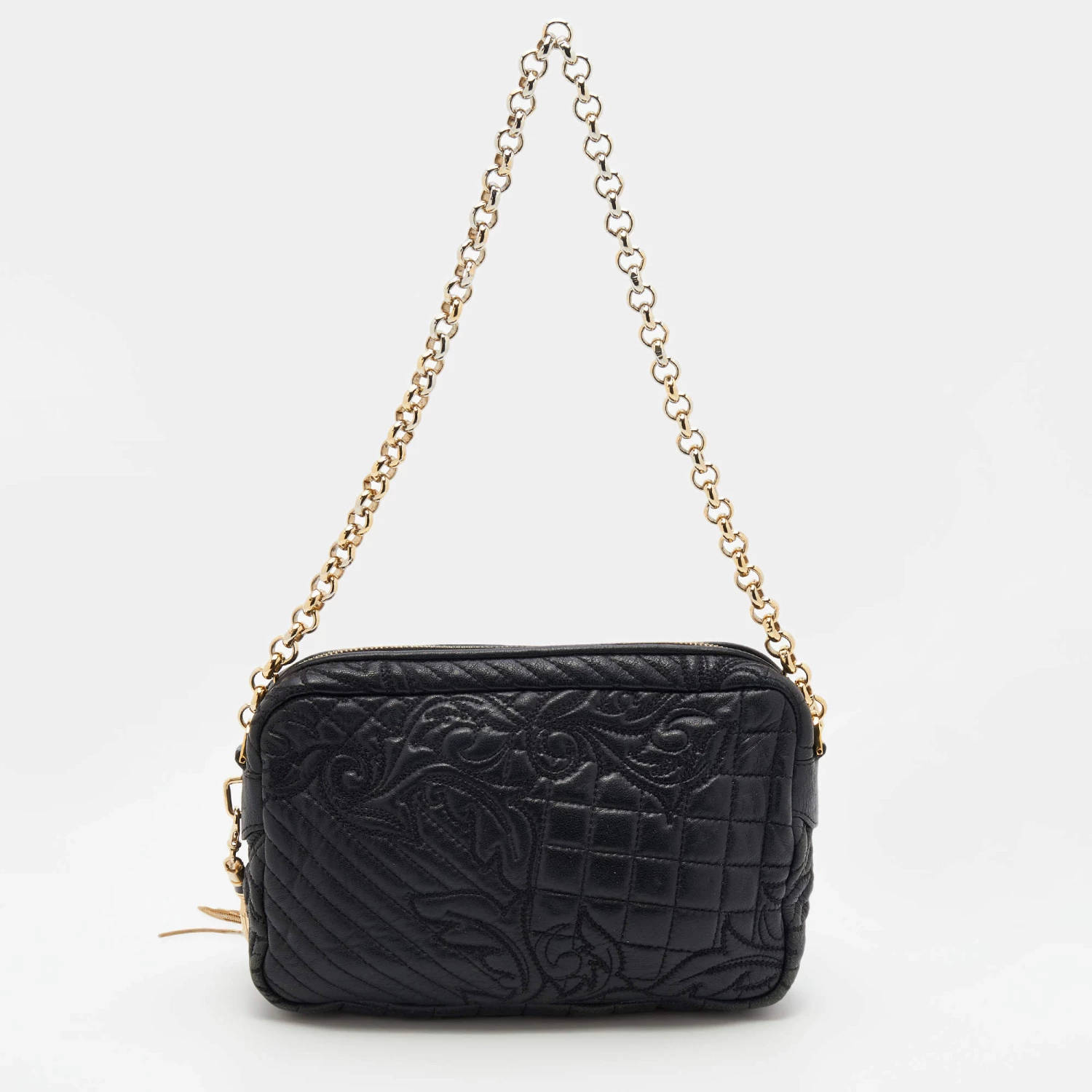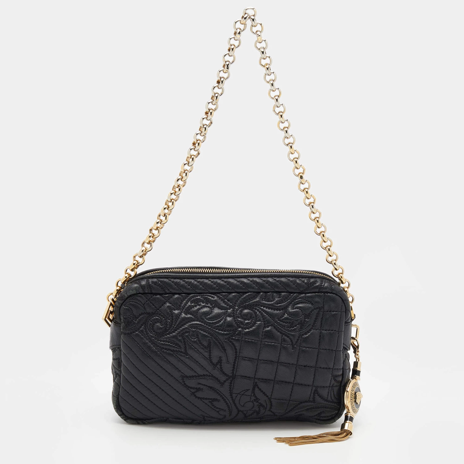 How gorgeous is this bag from Versace! Crafted from black leather and gold-tone hardware, it carries an outstanding design. It has a fabric interior secured by a zipper, and it is held by a chain strap. The tasselled-Medusa charm uplifts its beauty and makes it a buy you will not regret.