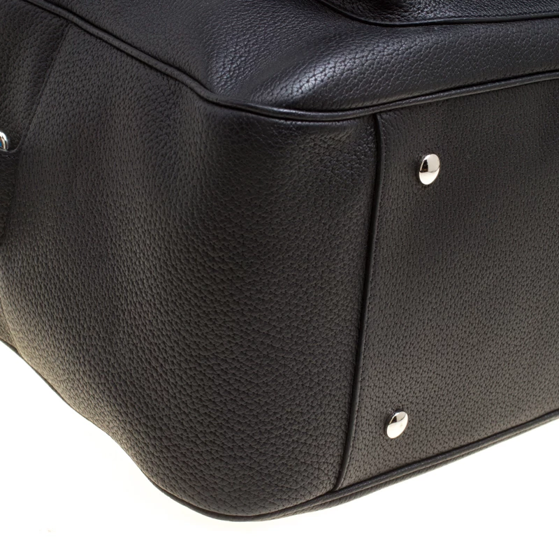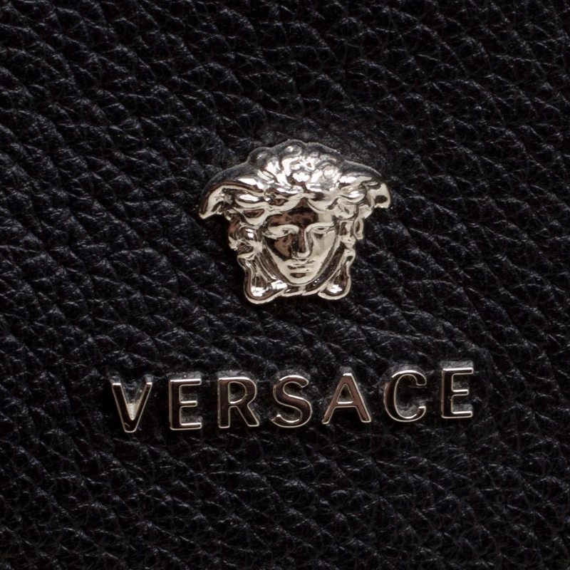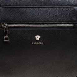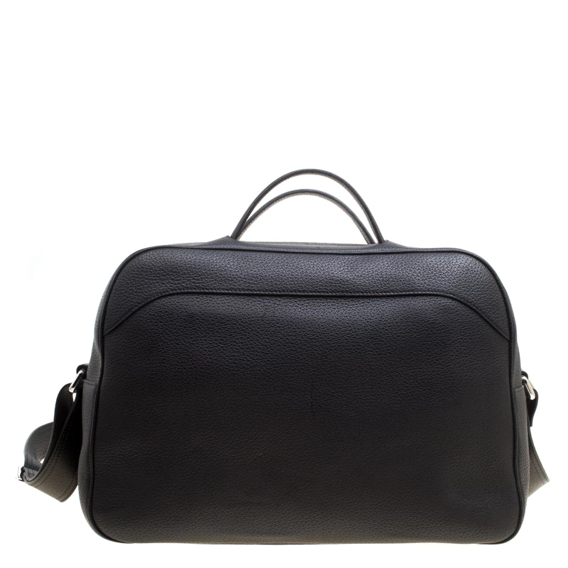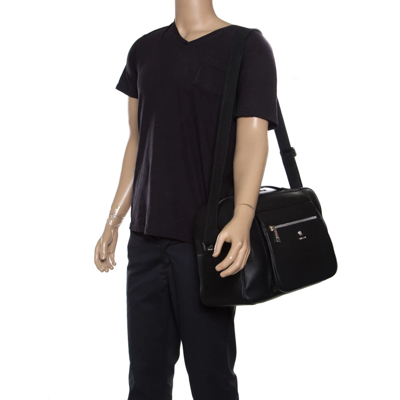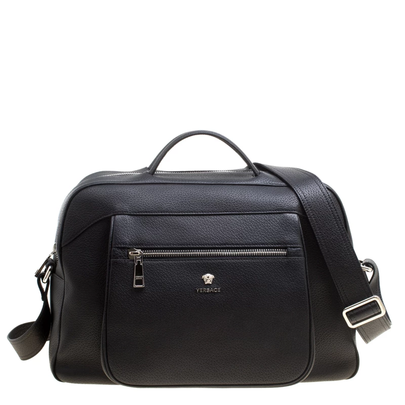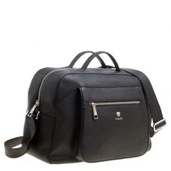 This investment-worthy duffel bag from Versace owns an aura of elegance and subsequently, it transfers the same to its bearer. It is crafted from smooth black leather into a sturdy and durable structure. It features a zipped pocket to the front accented with the silver-tone brand label and the signature Medusa logo. The zip top leads to an interior that has a fabric lining and features a zip pocket. It is complete with two top handles that can be handheld to flaunt this beauty in contemporary fashion along with a shoulder strap for times when you want to march freely. Lay your hands on this chic creation today and travel in style.